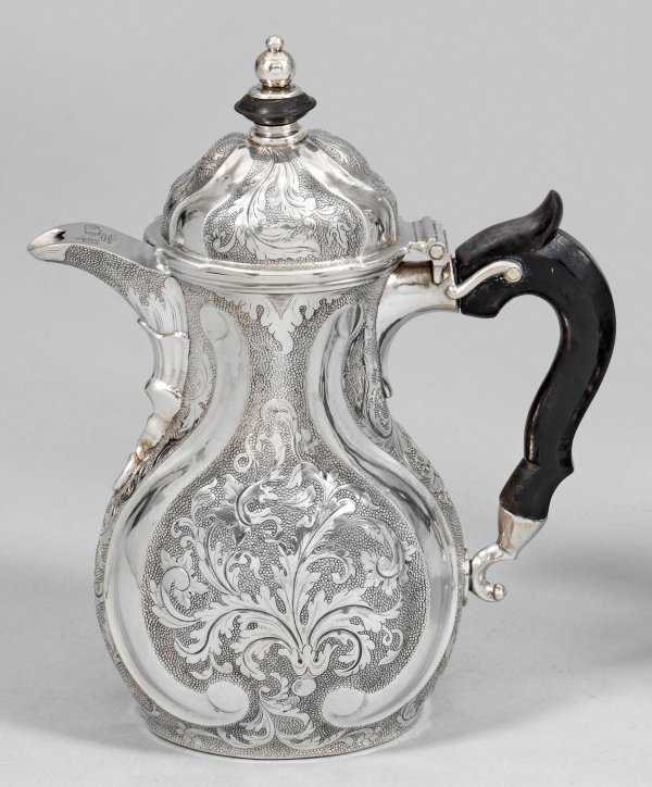 Silber. Birnförmig über flachem Stand. Wandung unterteilt durch geschweifte, glatte Züge im Wechsel mit üppigen, ziselierten Blattranken umgeben von feinem Schlangenhautdekor. Korrespondierender, haubenförmiger Scharnierdeckel mit Balusterknauf. Konsolausguss mit gravierten Initialien "G.K.P" unter Königskrone. Volutenhenkel aus ebonisiertem Holz. Minim. best.; Gest. 12 Lot, Tremolierstrich, Meister Gerhard Carl Zell (wird Meister 1832). Gew. ca. 505 g. H. 21,5 cm.