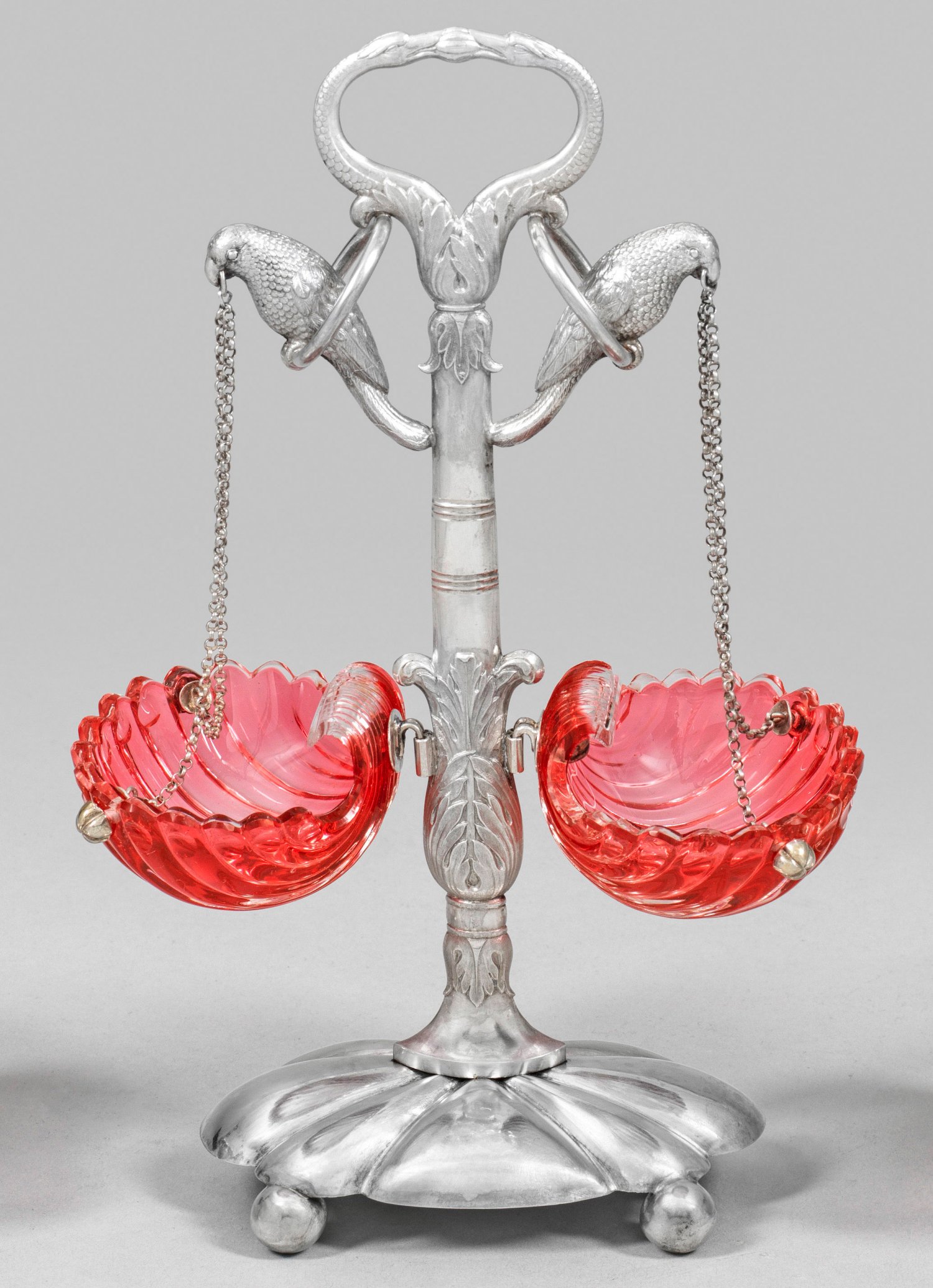 Silber und farbloses, hellrot überfangenes Glas. Über vier Kugelfüßen, passig geschweifter, achtfach blütenförmig godronierter Stand. Mittig hoch aufsteigender Schaft in ösenförmiger Handhabe aus zwei stilisierten Schwanenköpfen endend. Schaft unterteilt durch große Akanthusblätter und mehrfache Profillinien. Seitlich unter der Handhabe zwei große Ringe, darin je ein vollplastisch gearbeiteter Papagei. Im Schnabel eine zweigeteilte Kette haltend, die an der darunter angebrachten muschelförmigen Glassaliere befestigt ist. Gew. ca. 305 g. H. 24 cm.