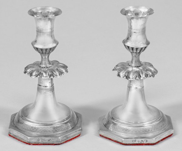 A pair of small Wroclaw Biedermeier weighted silver candlesticks by Dethlef Dethlefsen (master since 1840). Damaged and partly restored. Assay, master´s mark, date letter "S".