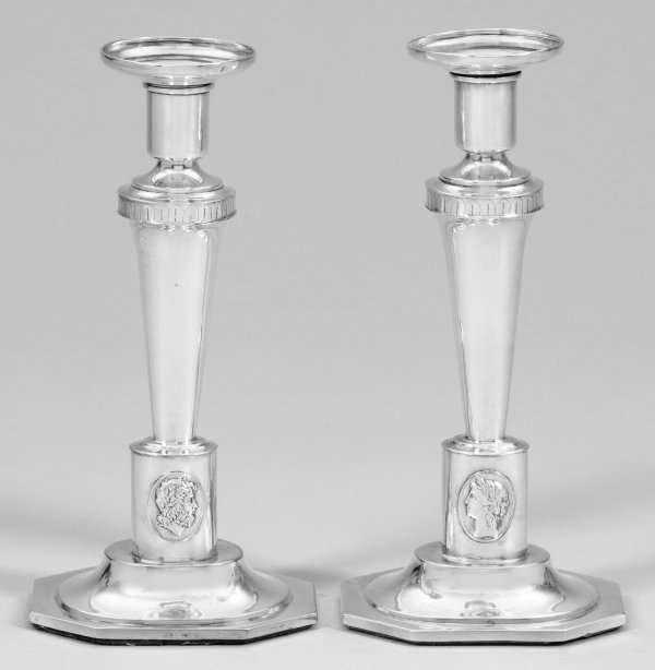 Silber, beschwert. Auf oktogonaler Plinthe ovaler, gering eingezogener Sockel, übergehend in gegliederten Säulenschaft. Am Ansatz im Ovalmedaillon je ein reliefierter, antikisierter Männer- sowie Frauenkopf im Profil. Zylindrische Tülle mit Einsatz und breiter Traufschale. Teilw. rest.; Gest. 13 Lot, Beschauzeichen, Meister "GS" für Johann Georg Carl Simmerlein (wird Meister 1833) oder Johann Georg Sippel (wird Meister 1845). Gew. zus. ca. 1175 g. H. 24 cm.