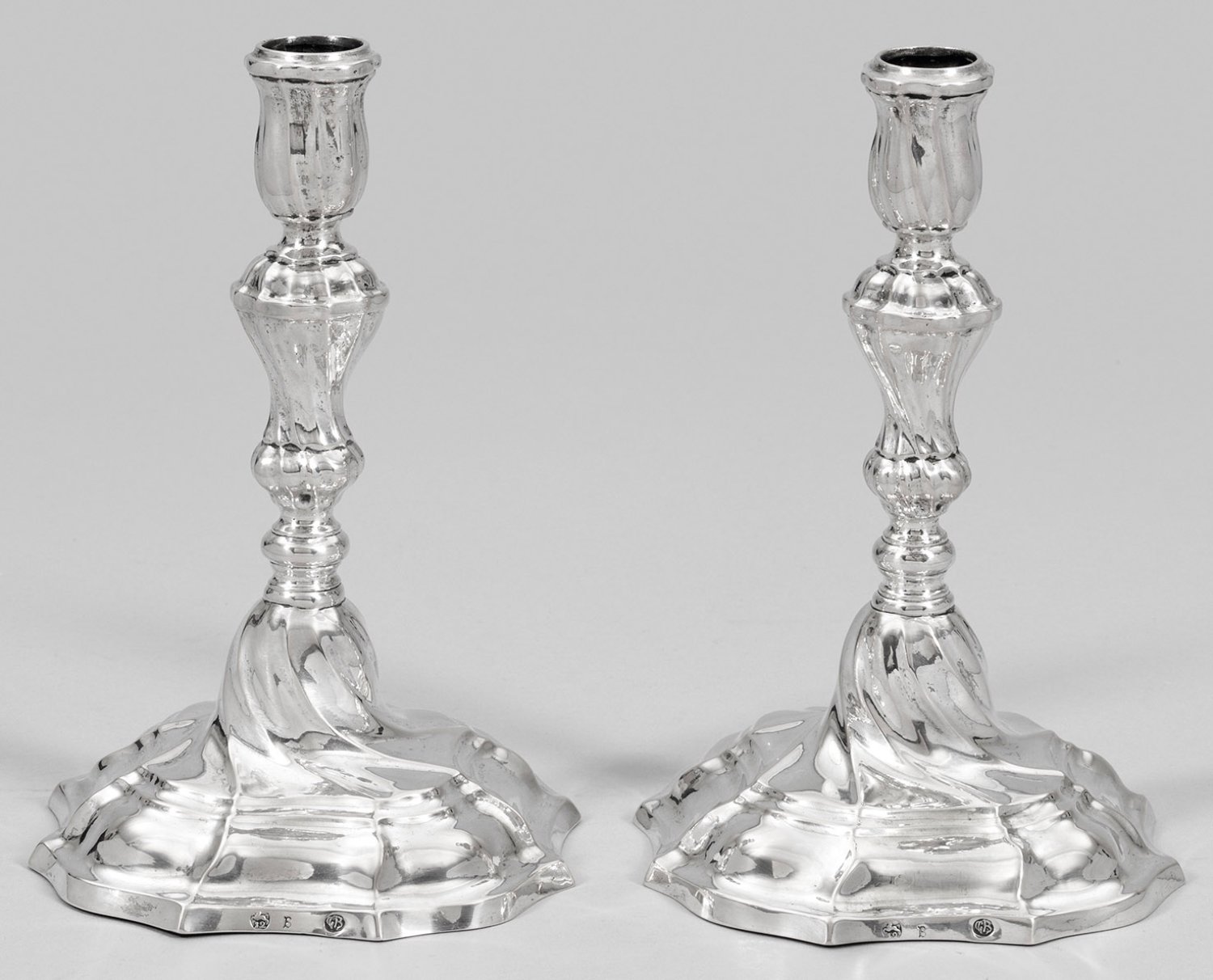 Silber. Gewölbter, passig geschweifter, nahezu quadratischer Stand mit gerundeten Ecken. Über gedrücktem Nodus kurzer Balusterschaft, übergehend in blütenkelchartige Tülle. Leuchterkorpus umlaufend harmonisch gegliedert durch vertikale, passige Züge. Ein Leuchterfuß minim. gedrückt. Gest. 12 Lot, Tremolierstrich, Beschauzeichen mit Jahresbuchstabe "B", Meister Georg Carl Brenner (wird Meister 1754). Gew. zus. ca. 585 g. H. 20 cm.