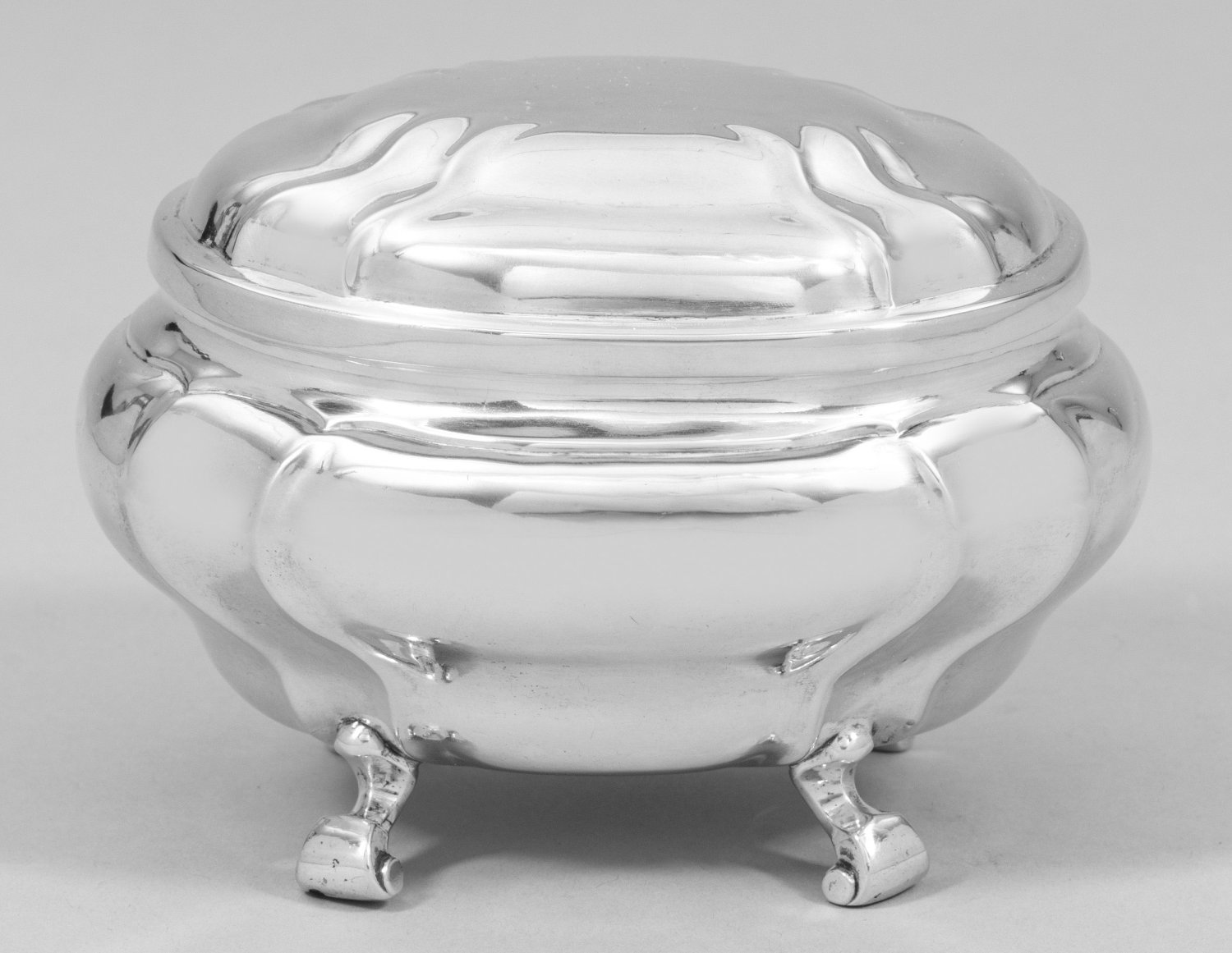 Silber. Über vier ausgestellten und eingerollten Füßen ovaler, gedrückt bauchig ansteigender Korpus. Wandung und gewölbter Scharnierdeckel vierfach gegliedert durch je zwei wellenförmige Züge. Gest., Beschauzeichen, Ältermannsbuchstabe "H", Meister wohl Frantz Peter Bun(d)sen (Bürger in der Neustadt ab 1754, Bürger und Hofgoldschmied in der Altstadt ab 1770). Gew. ca. 370 g. H. 9,5 cm. 13,5 cm - 10,5 cm.