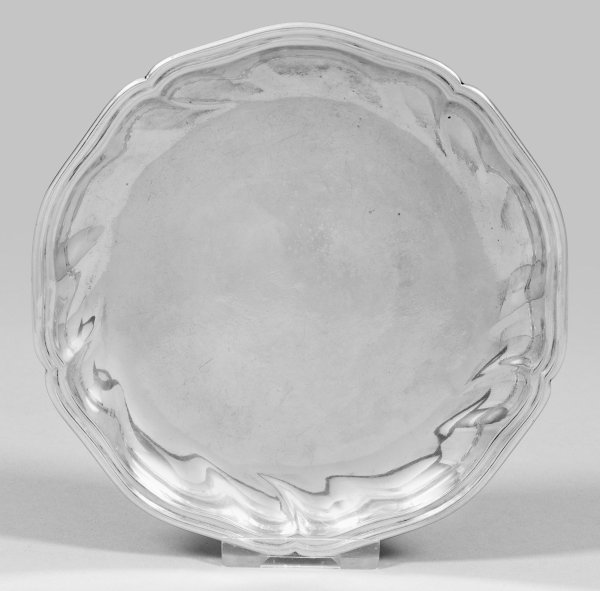 Silber. Rund, in klassischer Chippendaleform. Gering gemuldeter, glatter Spiegel, übergehend in leicht ansteigende Fahne und blütenförmig geschweiften, profilierten Rand. Gest. 12 Lot, Beschauzeichen, Meister Frantz Peter Bun(d)sen (Bürger in der Neustadt ab 1754, Bürger und Hofgoldschmied in der Altstadt ab 1770). Gew. ca. 120 g. D. 14 cm.