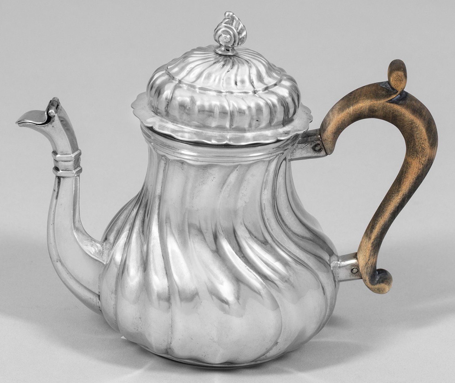 Silber. Über flachem Stand, gedrückt bauchiger Korpus, flächendeckend umzogen von in sich gedrehten, wellenförmigen Godronen. Tief angesetzter, facettierter Ausguss mit scharnierter Abdeckung. Korrespondierend godronierter, profilierter Scharnierdeckel mit ausgestelltem, passig geschweiftem Rand und konischem Silberknauf. Ebonisierter Ohrenhenkel. Gest., Tremolierstrich, Beschauzeichen, Meister Johann Samuel Beckensteiner (wird Meister 1743). Gew. ca. 245 g. H. 13,5 cm.