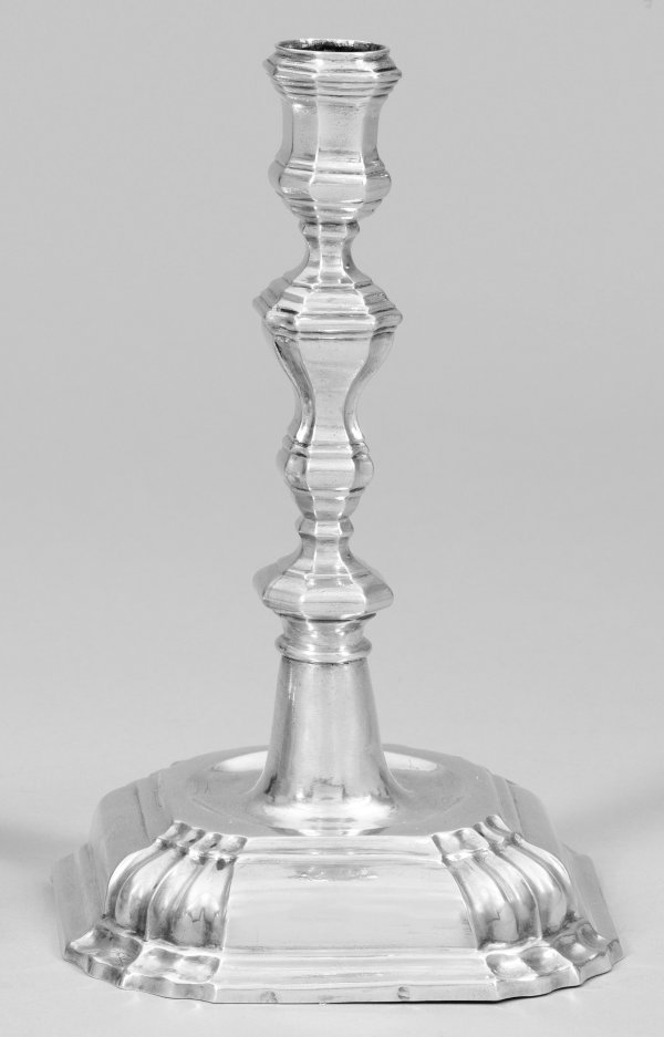 Silber. Nahezu quadratischer, an den Ecken abgerundeter und von schmalen Graten gegliederter Stand, übergehend in gemuldeten Ansatz. Mehrfach von gekanteten Nodi unterteilter Balusterschaft in vasenförmiger Tülle endend. Gest., Tremolierstrich, Beschauzeichen, Meister Henrich Albert Pislinger (wird Meister 1730). Gew. ca. 420 g. H. 21 cm.