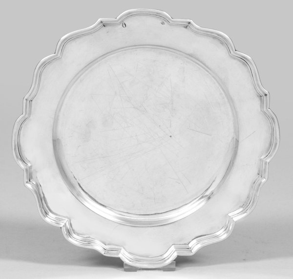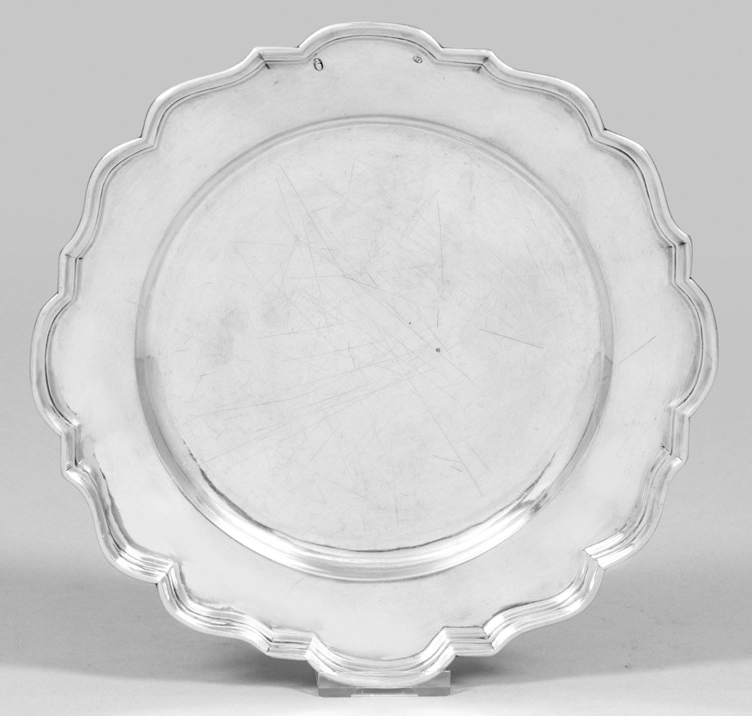 Silber. Runde Form. Vertiefter, glatter Spiegel mit gemuldetem Anstieg. Breite, gering aufsteigende Fahne mit mehrfach profiliertem, passig geschweiftem, blütenförmigem Rand. Altersbedingte Gebrauchsspuren. Gest., Tremolierstrich, Beschauzeichen, Meister Johann Christoph Stenglin (wird Meister um 1737). Gew. ca. 215 g. D. 21 cm.