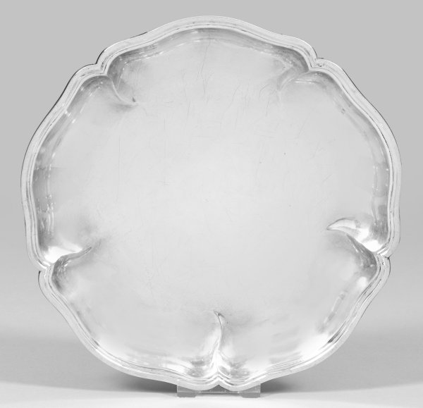 Silber. Gering gemuldeter, glatter Spiegel, übergehend in leicht ansteigende Fahne und blütenförmig geschweiften, profilierten Rand. Auf der Unterseite gravierte Initialien "M.S.". Gest., Beschauzeichen, Jahresbuchstabe "L", Meister Johann Gottfried Schlaubitz (wird Meister 1733). Gew. ca. 650 g. D. 25 cm.