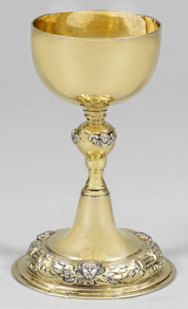 Silber, teilw. vergoldet. Mehrfach gestufter, aufgewölbter Rundfuß, umlaufend einreihig verziert mit getriebenen Cherubköpfen im Wechsel mit volutierten Akanthusblättern. Trompetenförmiger Schaftansatz, übergehend in kurzen Balusterschaft, mittig unterteilt durch gestuft ansteigenden, gerundeten Nodus, korrespondierend einreihig besetzt mit reliefplastischen Cherubköpfen. Gedrückt bauchige, aufschwingende Kuppa. Innen vergoldet. Gest., Tremolierstrich, Meister Johann Gottfried Pick (wird Meister 1741), Preußischer Steuerstempel seit 1809. Gew. ca. 290 g. H. 18 cm.