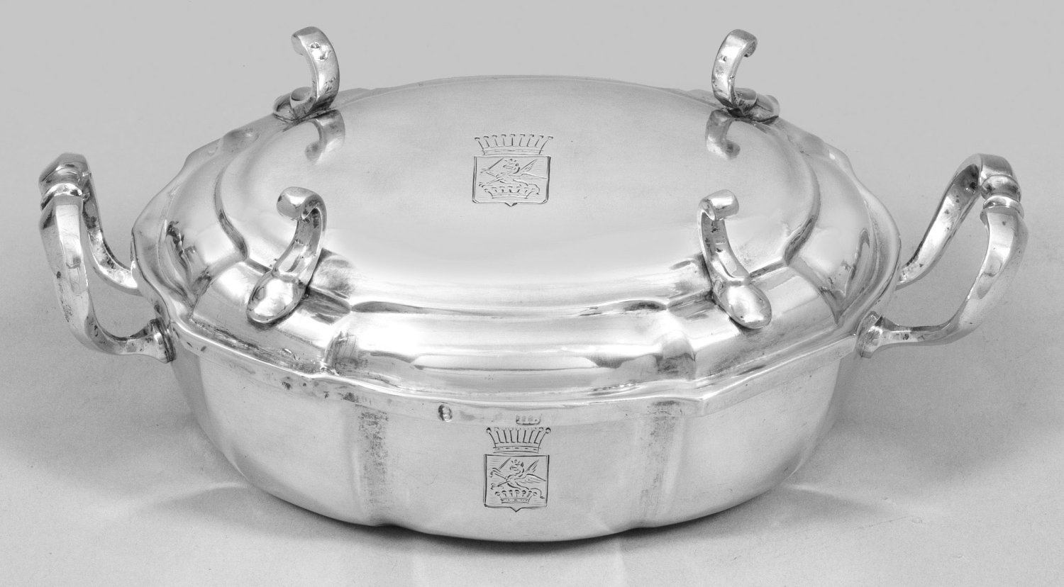 Silber. Sich bauchig erweiternder, ovaler Korpus. Gewölbter, gestufter Deckel mit vier gebogten, eingerollten Füßen, als Schale verwendbar. Korpus und Deckel gegliedert durch breite, vertikale Züge. Schauseitig auf der Wandung und dem Deckel je das gravierte Wappen der Grafen Bánffy de Losoncz aus Ungarn mit Greif, aus einer Freiherrenkrone erwachsend und ein Schwert führend. Seitlich je ein passig geschweifter Henkel. Innen mit Restvergoldung. Gest., Tremolierstrich, Beschauzeichen, Meister Johann Jakob II Bruglocher (wird Meister 1710). Gew. ca. 265 g. H. 6,5 cm.