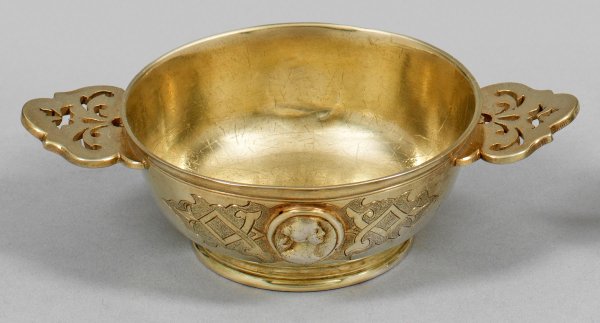 Silber, vergoldet. Runder, gering eingezogener Standring, übergehend in bauchige, tief gemuldete Schale mit seitlich zwei horizontalen, passig geschweiften und floral durchbrochen gearbeiteten Handhaben. Schauseitig je ein von Bandelwerk über punziertem Grund gerahmtes Medaillon mit reliefplastischer Damenbüste. Minim. altersbedingte Gebrauchsspuren. Gest., Tremolierstrich, Beschauzeichen, Meister Gottlieb Menzel (wird Meister 1709). Gew. ca. 65 g. D. 6,5 cm.