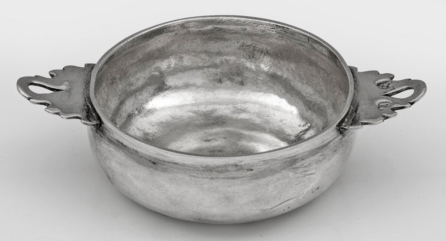 Silber. Über leicht eingezogenem, flachem Stand bauchiger, runder Korpus mit glatter Wandung. Flache, passig geschweifte und durchbrochen gearbeitete Handhaben. Gest., Beschauzeichen, Meister Rudolf (Rolf) Knipper (wird Meister 1709). Gew. ca. 20 g. H. 2 cm. D. 4,8 cm.