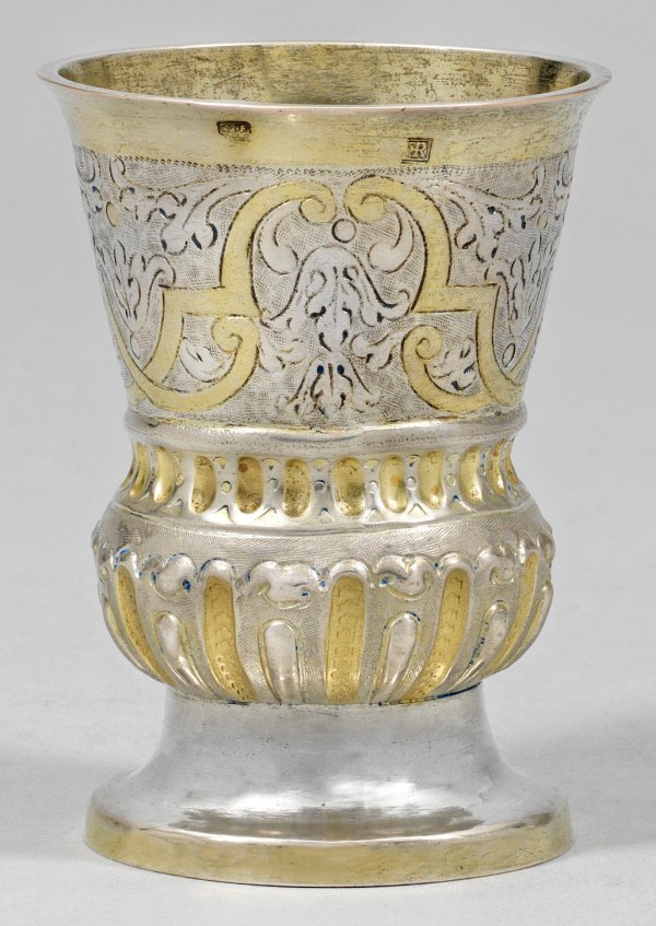 Silber, teilw. vergoldet. Trompetenförmiger, breiter Stand, übergehend in kratervasenförmigen, gebauchten, sich konisch erweiternden Korpus. Untere Wandungshälfte reliefplastisch umzogen von zungenförmigen Kanneluren und Godronen mit punziertem Dekor. Obere Wandungshälfte flächendeckend verziert mit fein graviertem Bandel- und Blattwerk über zart punziertem Grund. Glatte, durch filigrane Profillinie abgesetzte Randzone. Innen vergoldet. Gest., Beschauzeichen, Meister Siegmund Wolfgang Preuss (wird Meister 1694). Repunzierung für Österreich-Ungarn, Brün (1806/1810-1824). Gew. ca. 70 g. H. 9 cm.