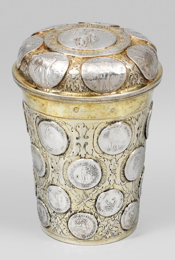 Silber, teilw. vergoldet. Konische Form, übergehend in glatte, durch Profillinien unterschiedlicher Breite abgesetzte Randzonen mit mehrfach profiliertem, gering ausgestelltem Lippenrand. Gerundeter, aufgewölbter Stülpdeckel. Becherkorpus und Deckel flächendeckend mit insgesamt 33 eingefassten Münzen verziert und gerahmt von feinem Blüten- und Blattrankendekor über zart punziertem Grund. Der Deckel zentral mit eingelassener 1-Taler-Münze und umzogen von sieben 1/3-Talern des Kurfürstentums Braunschweig-Lüneburg. Auf der Wandung 24 Münzen u. a. Mariengroschen, auf dem Revers mit Wildermannmünze sowie Heiligem Andreas. Im Boden ein eingelegter 1/2-Taler mit Porträt von Johann Georg I. Kurfürst von Sachsen (1615-1656) zum 100-jährigen Jubiläum der Augsburger Konfession am 25. Juni 1630. Innen vergoldet. Gest., Tremolierstrich, Beschauzeichen, Meister Zacharias Kramer (heiratet 1708). Preußischer Steuerstempel von 1809. Gew. ca. 395 g. H. 14,5 cm.