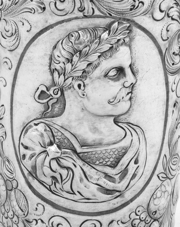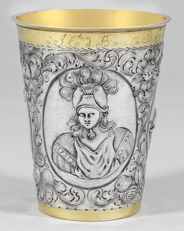 Silber, teilw. vergoldet. Konischer, hoher Becher über flachem Stand. Wandung unterteilt durch drei hochovale Medaillons mit ausdrucksstark getriebenen Porträtbüsten. Neben der Büste eines römischen Imperators mit Lorbeerkranz und antikisiertem Gewand, das Porträt eines zeitgenössisch gekleideteten Soldaten in Harnisch, mit Umhang und aufgewölbtem Helm, bekrönt von üppigen Federn. Zudem die Darstellung eines Osmanen, in prächtiger, traditioneller Kleidung mit Pfeilen und Bogen. Glatte, durch ornamentierte Profillinien abgesetzte Randzonen übergehend in profilierten, ausgestellten, schmalen Lippenrand. Wandung umlaufend verziert mit fein getriebenen und punzierten Blattranken, großen Blüten und üppigen Fruchtbündeln. Innen vergoldet. Gest., Beschauzeichen, Meister Arnold von der Hagen (Meister seit 1695). Gew. ca. 220 g. H. 13,5 cm.