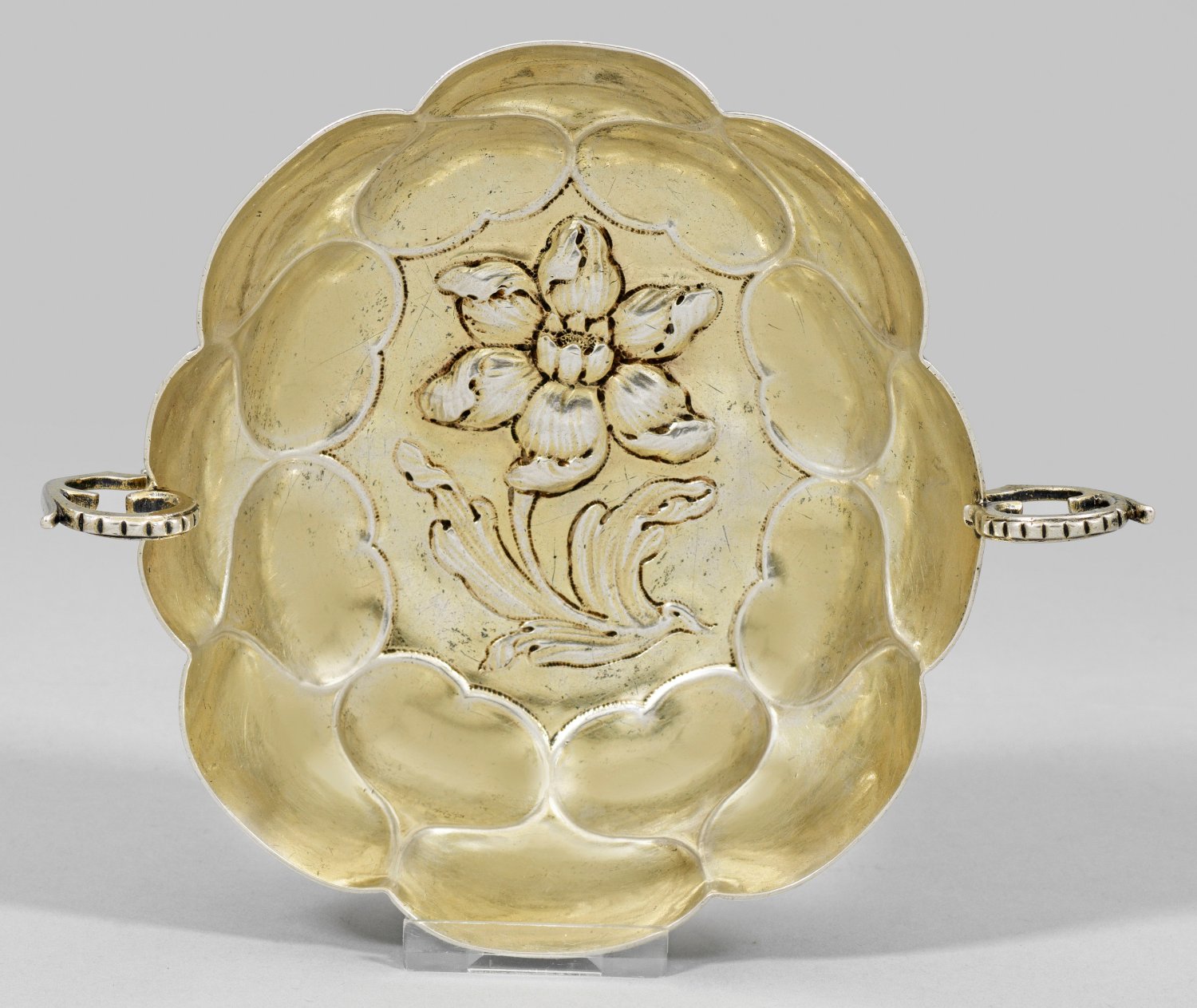 Silber, teilw. vergoldet. Ovaler, achtpassig geschweifter Korpus. In glattem Spiegel reliefplastisch getriebener und zart punzierter Blütenstängel. Aufschwingender, wellenförmiger Rand mit reliefplastisch ausgearbeiteten, umgedrehten Herzbuckeln. Seitlich zwei Volutenhenkel. Gest., Tremolierstrich, Beschauzeichen, Meister Heinrich II Eichler (wird Meister um 1705). Gew. ca. 170 g. 14,5 cm x 17 cm.