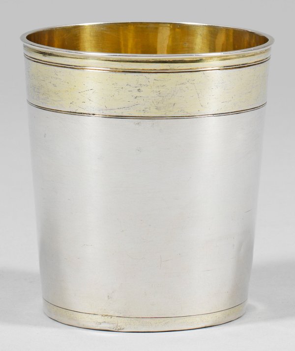 Silber, teilw. vergoldet. Konische Form mit profiliertem, geringfügig ausgestelltem Lippenrand. Glatte Wandung mit Randzonen unterschiedlicher Breite, abgesetzt durch schmale Profillinien. Innen vergoldet. Minim. best.; Gest., Tremolierstrich, Beschauzeichen, Meister Johann II Leser (wird Meister 1676). Gew. ca. 140 g. H. 9 cm.