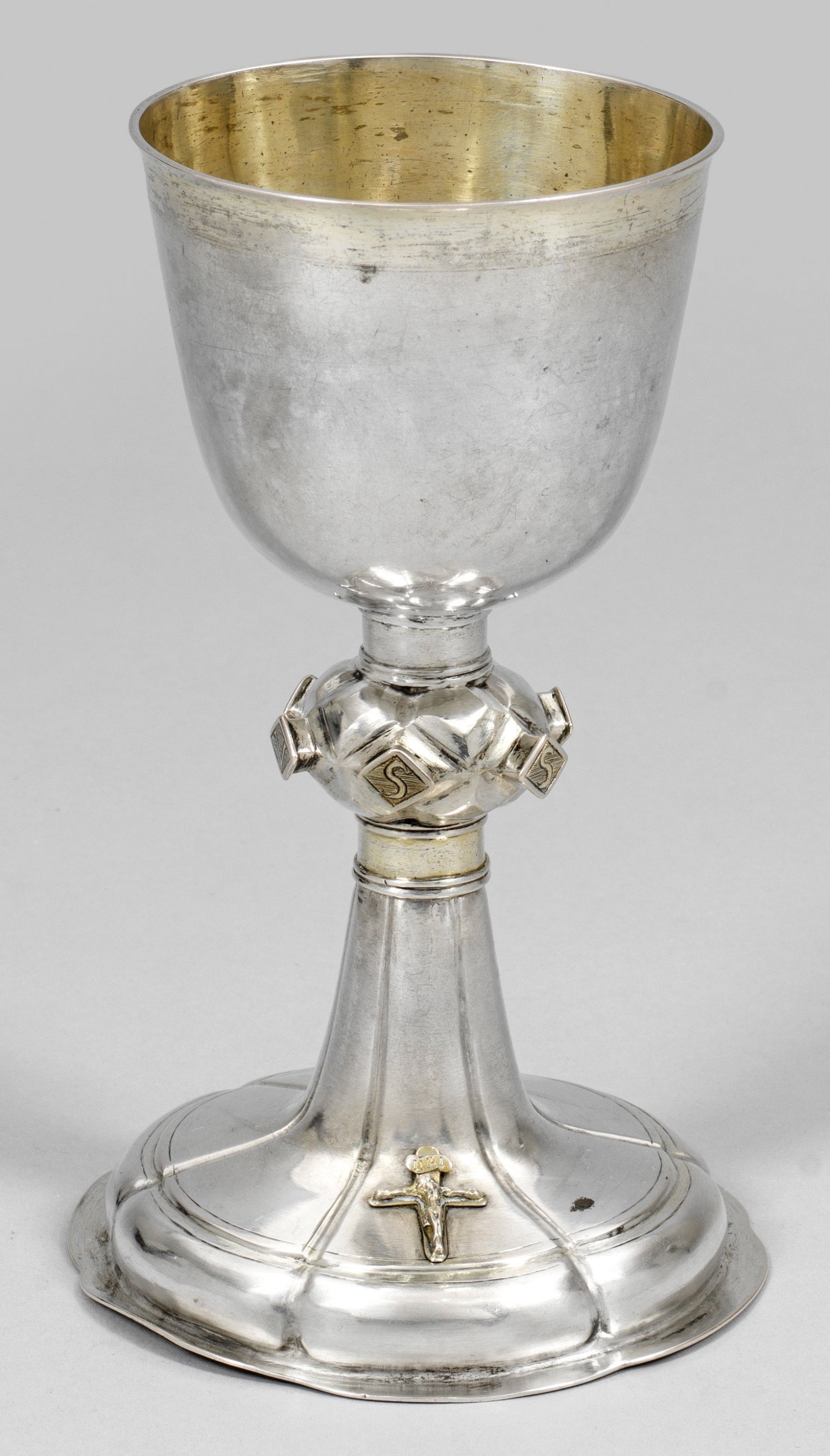 Silber. Zweistufig aufgewölbter, passig geschweifter und von vertikalen Kannelierungen gegliederter, trompetenartiger Fuß mit ausgestelltem Standring. Auf dem Fuß reliefplastisches, appliziertes Kruzifix. Kurzer Schaft, zentral mit gedrücktem Nodus und sechs Rotuli mit gravierten Majuskeln "IESVSS" über schraffiertem Grund. Glockenförmig aufschwingende, glatte Kuppa mit durch zarte Profillinien abgesetzter Randzone. Innen vergoldet. Mit Restvergoldung. Teilw. best.; Gest., Meister Franz Jürgen Ritter (gest. um 1738). Gew. ca. 310 g. H. 21 cm.