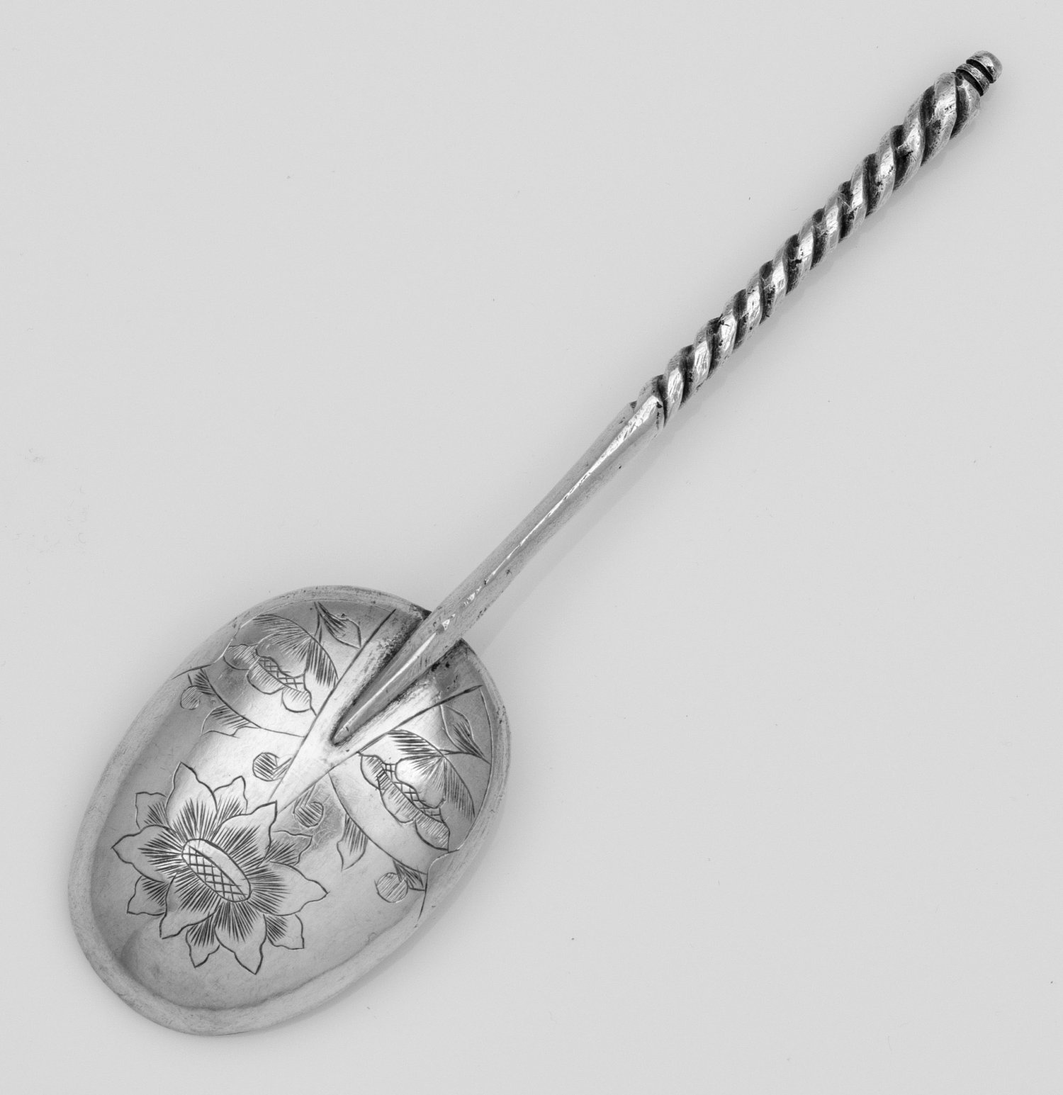 Silber. Ovoide, gemuldete Laffe, übergehend in stielähnlichen, facettierten und in sich gedrehten Griff. Unterseite der Laffe mit kurzem, profiliertem Rattenschwanz, umzogen von gravierten großen Blüten. Gew. ca. 45 g. L. 17,5 cm.