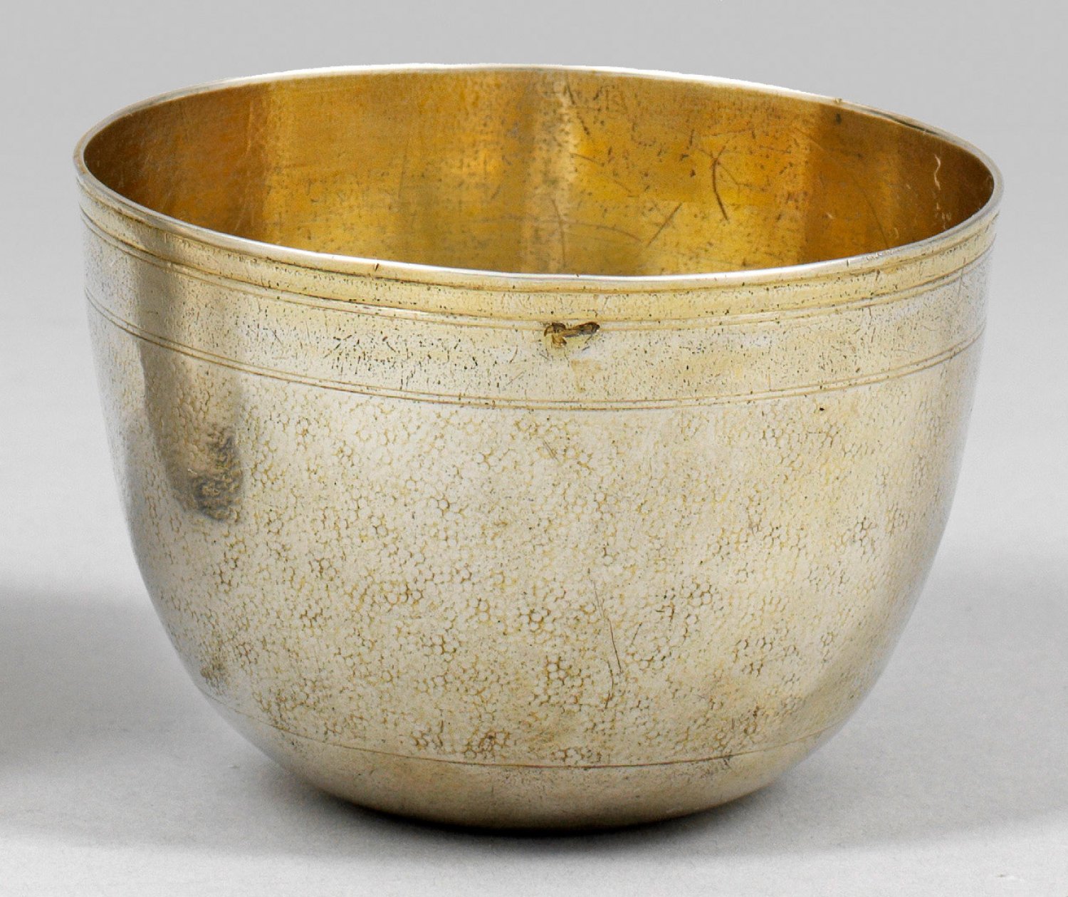 Silber, vergoldet. Sich bauchig erweiternder Korpus mit glattem, durch mehrfache zarte Profillinien gegliedertem und abgesetztem Rand. Wandungsmitte umlaufend verziert mit feiner Schlangenhautpunzierung. Gest., Tremolierstrich, Meister Peter Kick (wird Meister um 1700), französische Garantiemarke (1798-1809). Gew. ca. 65 g. H. 4,8 cm.