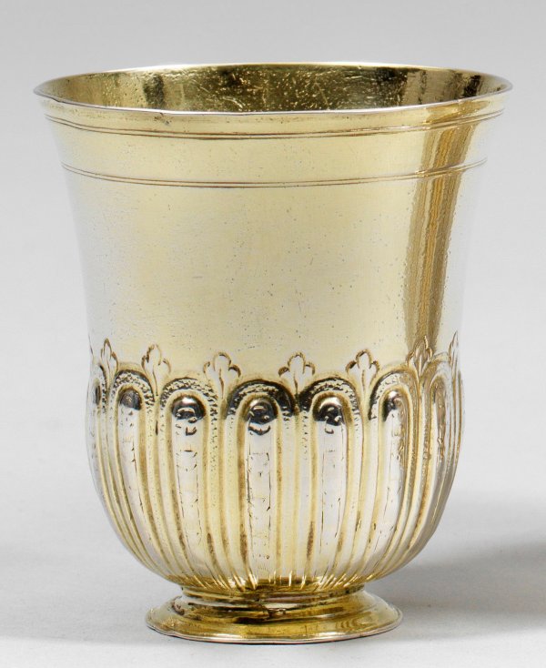 Silber, teilw. vergoldet. Auf flachem, von schmalen Profillinien umzogenem und gekehltem Rundstand hoch aufsteigende, gering ausschwingende, glockenförmige Kuppa. Durch doppelreihig angeordnete Profillinien abgesetzter Lippenrand. Untere Wandungshälfte umzogen von reliefplastisch getriebenem Zungenfries mit fein punziertem, alternierendem Blattdekor verziert und bekrönt von stilisierten, rautenförmigen Blättern. Innen vergoldet. Gest., Tremolierstrich, Beschauzeichen, undeutliche Meistermarke wohl Matthäus II Baur (wird Meister um 1681) sowie Pächterstempel für Paris (1687-1691). Gew. ca. 45 g. H. 5,8 cm.