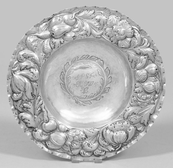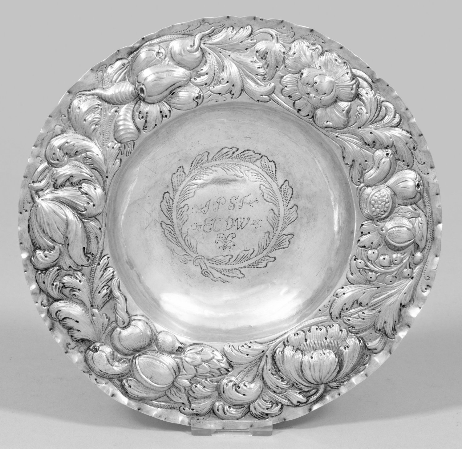 Silber. Runde Form. Tief gemuldeter, mittig gering aufgewölbter Spiegel, übergehend in breite Fahne mit wellenförmig gekniffenem Rand. Fahne flächendeckend verziert mit üppigem Blüten- und Früchtedekor. Im Spiegel punzierter Lorbeerkranz als Rahmen für Gravur " J.P.S.F" und "E.C.D.W". Gest., undeutliches Beschauzeichen, Meister wohl Hans Jakob II Baur (wird Meister um 1682). Französischer Einfuhrstempel, Paris (1864-1893). Gew. ca. 140 g. D. 21 cm.