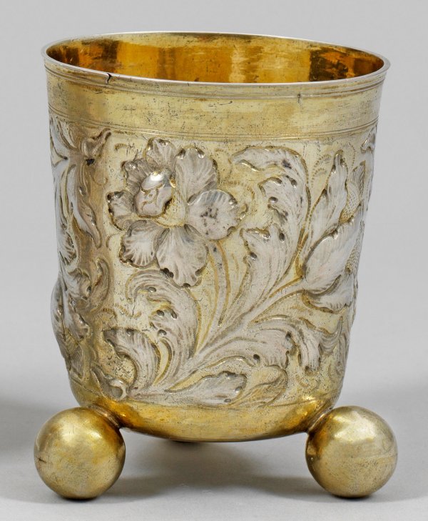 Silber, teilw. vergoldet. Nahezu zylindrischer Korpus auf drei ausgestellten Kugelfüßen. Durch schmale Profillinien abgesetzte, glatte Randzone mit gering ausschwingendem Lippenrand. Auf der Wandung umlaufend äußerst fein getriebener und punzierter, flächendeckender Akanthusblattdekor mit großen Blüten. Innen vergoldet. Gest., Beschauzeichen, Meister Joachim Krumpholtz (wird Meister 1669), Jahresbuchstabe "S". Gew. ca. 135 g. H. 10 cm.