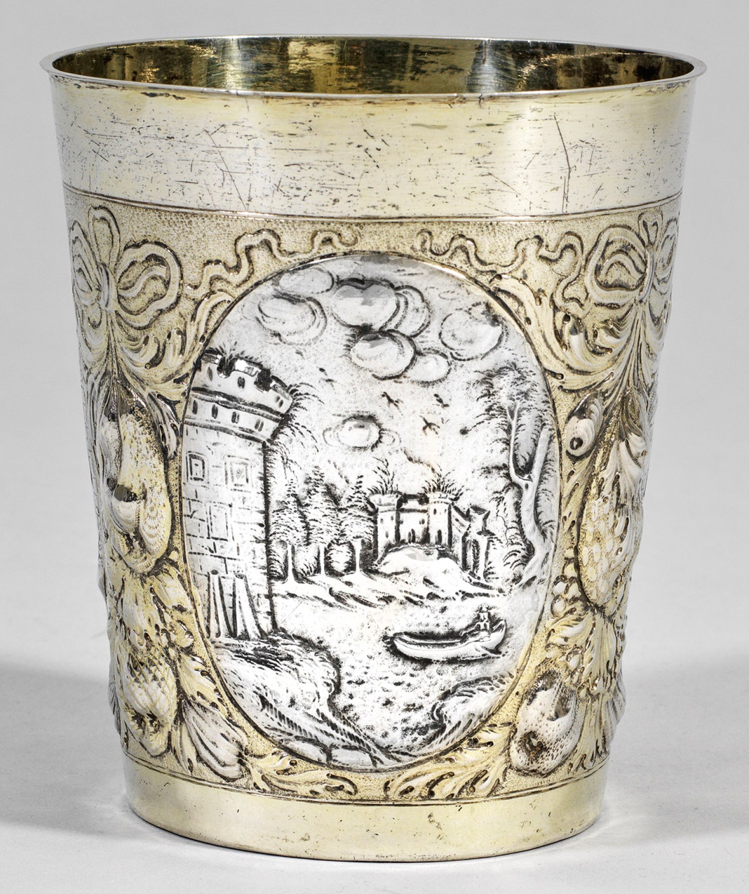 Silber, teilw. vergoldet. Hoher, konischer Korpus mit glatten Wandungsrändern. Wandung unterteilt durch drei ovale Kartuschen mit unterschiedlichen, architekturbestandenen Landschaften. Im Wechsel mit schleifengetragenen, naturalistischen Fruchtgehängen über schlangenhautähnlich punziertem Grund. Innen vergoldet. Gest., Beschauzeichen, Meister Johann Adam Kienlin d. Ä. (geb. 1628). Gew. ca. 255 g. H. 13,5 cm.