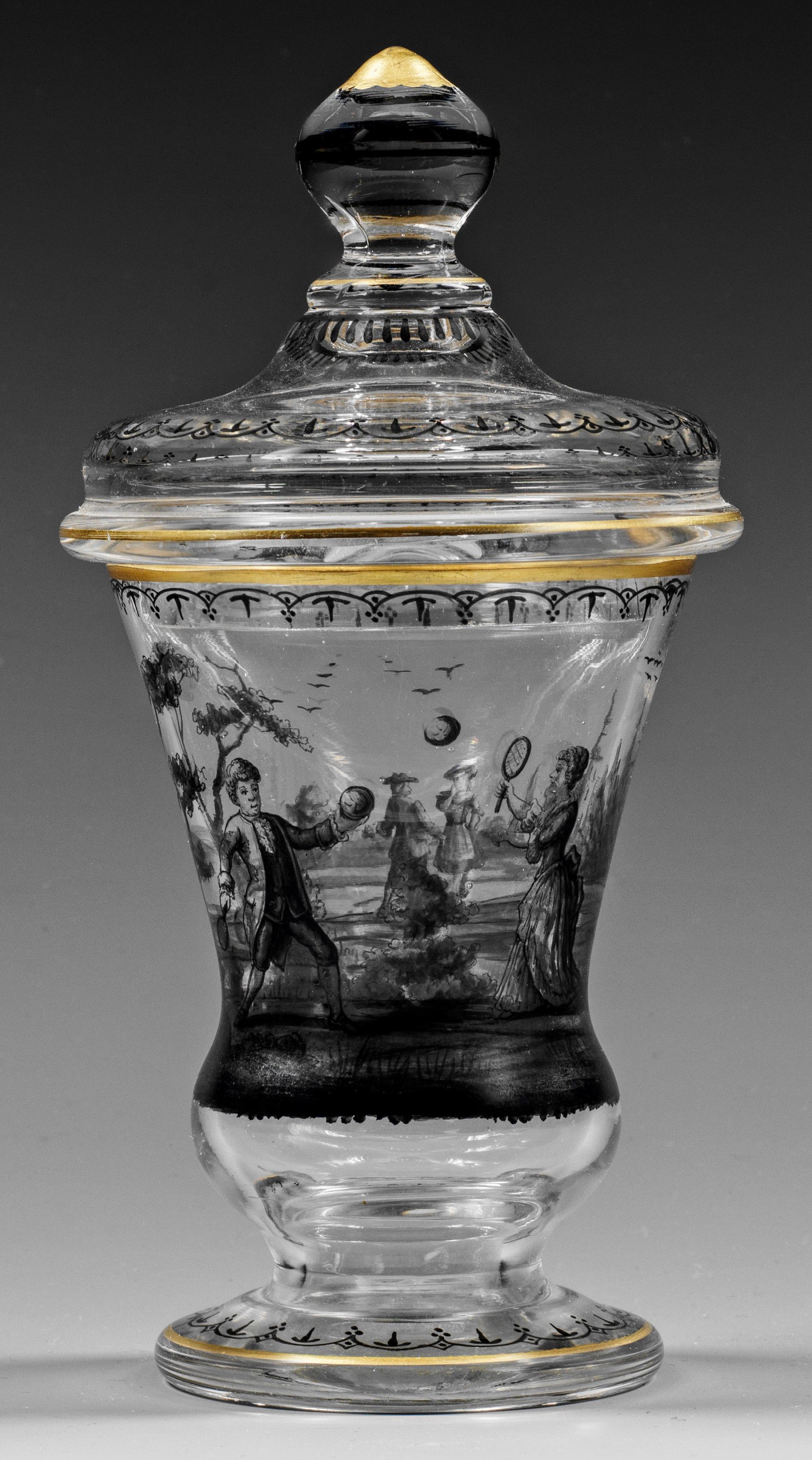 Glockenform, Farbloses Glas. Umlaufender Dekor in Schwarzlot-Grisaillemalerei. Auf der Kuppa ein Ball spielendes, höfisches Rokoko-Paar in einer Landschaft mit Schloss; Fuß-, Lippen- und Deckelrand mit Ornamenten und Vergoldung. H. 18,5 cm.