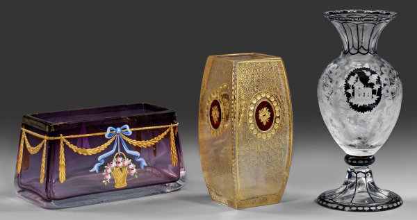 Two small Bohemian and Vienna glass vases and a bowl with cut, engraved, gold and enamel decor. One vase marked.