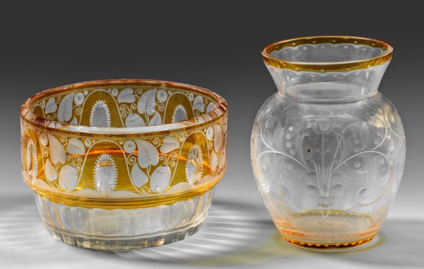 A Bohemian glass bowl and a vase with cut and engraved decor manufactured in Haida (Nový Bor).