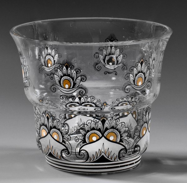Gegliederte Glockenform. Farbloses Glas. Ornamentaler Dekor in Schwarz und Gold, kombiniert mit Mattsalz. Entw. Adolf Beckert, Glasfachschule Steinschönau, um 1920. H. 11 cm; D. 13 cm.