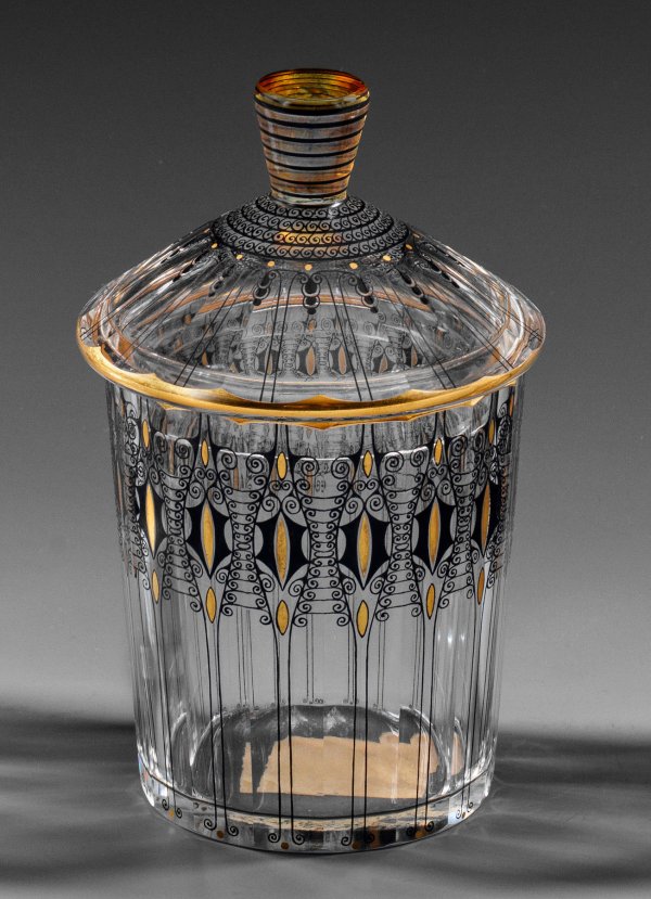 Annähernd zylindrisches Unterteil, konischer Deckel und bernsteingelb gebeizter Knauf, polygonaler Schälschliff. Ornamentaler Dekor in Schwarz und Gold. Entw. Adolf Beckert, Glasfachschule Steinschönau, um 1915-1920. H. 14,2 cm.