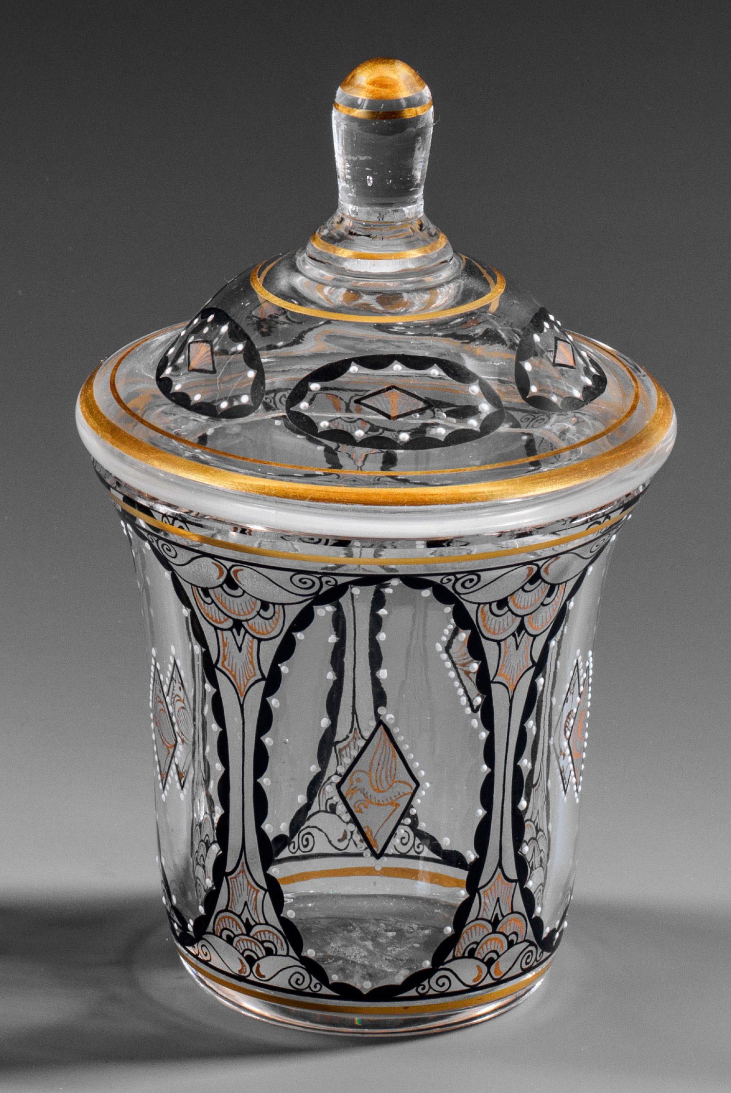 Farbloses Glas. Dekor in schwarzer und goldener Malerei, kombiniert mit weißen Emailpunkten und Mattsalz. Entw. Adolf Beckert, Glasfachschule Steinschönau, um 1915-1920. H. 15 cm.