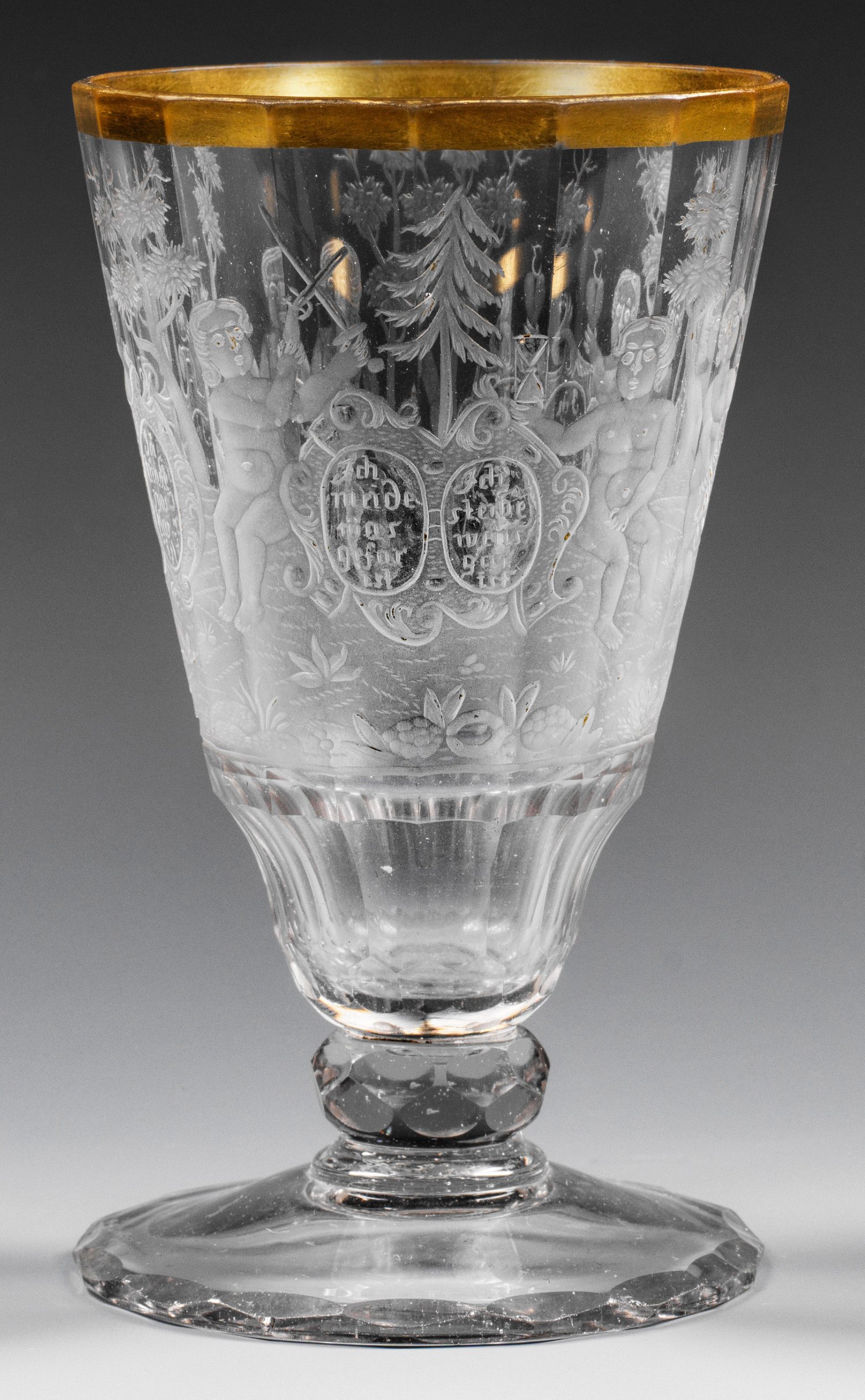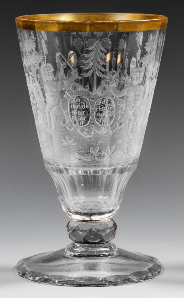 Farbloses Glas, geschliffen und graviert, vergoldeter Lippenrand. Ansteigender Fuß mit Schliffkante, wabenfacettierter Nodus, polygonal geschälte, facettierte, glockenförmige Kuppa mit eingezogenem Ansatz. Auf der Wandung feiner, geschnittener, teilw. geblänkter Dekor. Umlaufend eine baumbestandene Landschaft, darin Putten mit allegorischen Attributen und Schildreserven, bez. "Ich meide was gefar ist (/) Ich sterbe wens gar ist (/) Ich rede was wahr ist (/) Ich liebe was rahr ist (/) Ich esse was dar ist (/) ich trincke was klar ist". H. 13 cm.