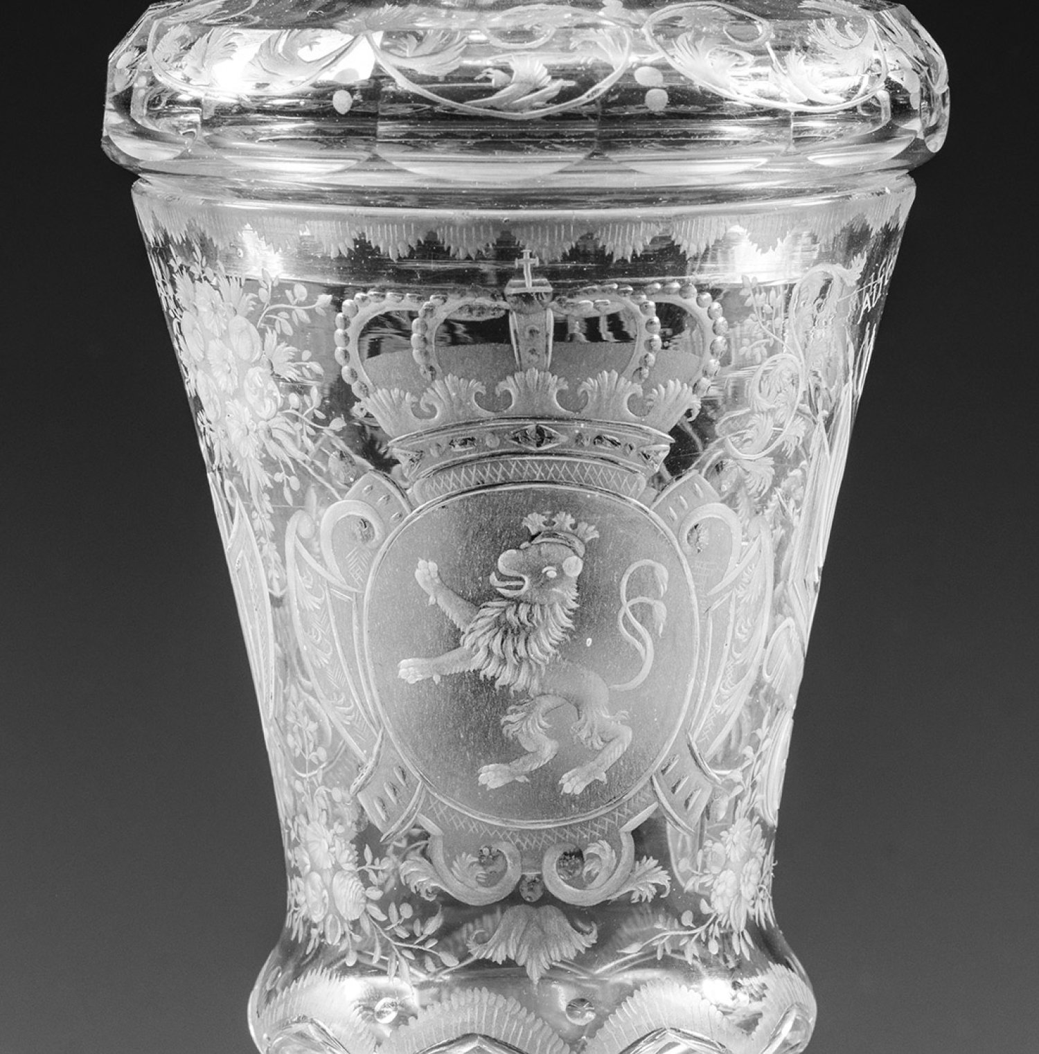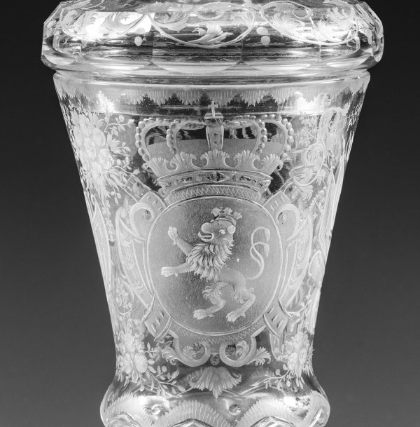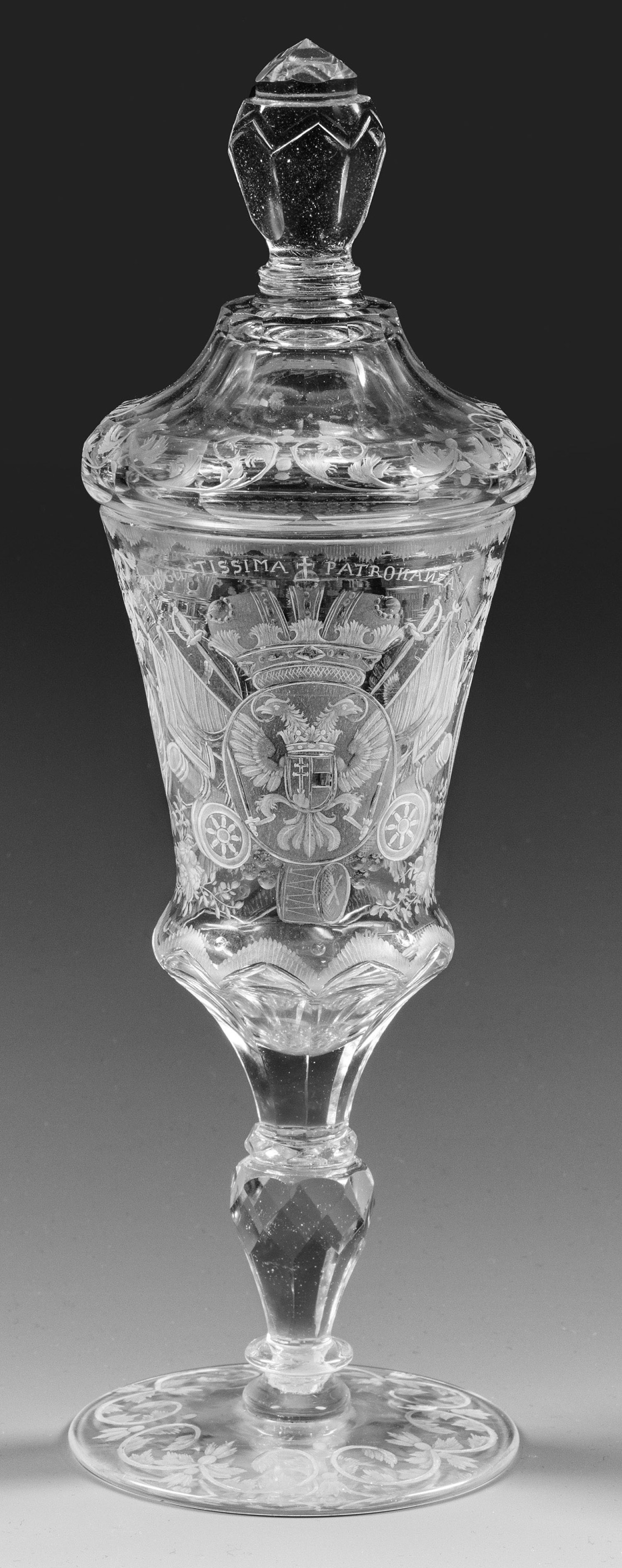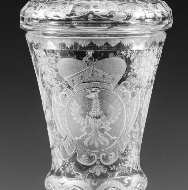 Farbloses Glas. Auf der glockenförmigen, am Ansatz eingezogenen und neunfach facettierten Kuppa in sehr feinem, teilw. geblänkten Schnitt ausgeführte, bekrönte Wappen. Schauseitig das Habsburgische Wappen mit Doppeladler, Schwert und Zepter sowie kleinem, gespaltenem Herzschild für Österreich und Ungarn, umrahmt von Trophäen und Standarten, darüber die Rudolfskrone und Inschrift ''AUGUSTISSIMA PATRONANZA''. Auf der Rückseite die Wappen des Königreichs Böhmen und des Herzogtums Schlesien umgeben von Blumenbuketts. Vielfach facettierter Balusterschaft, Scheibenfuß erg. und mit Bordüre aus geschnittenem, eingerolltem Rankenwerk verziert. Deckel entsprechend schliffverziert und mit floraler Schnittbordüre dekoriert. H. 27 cm.