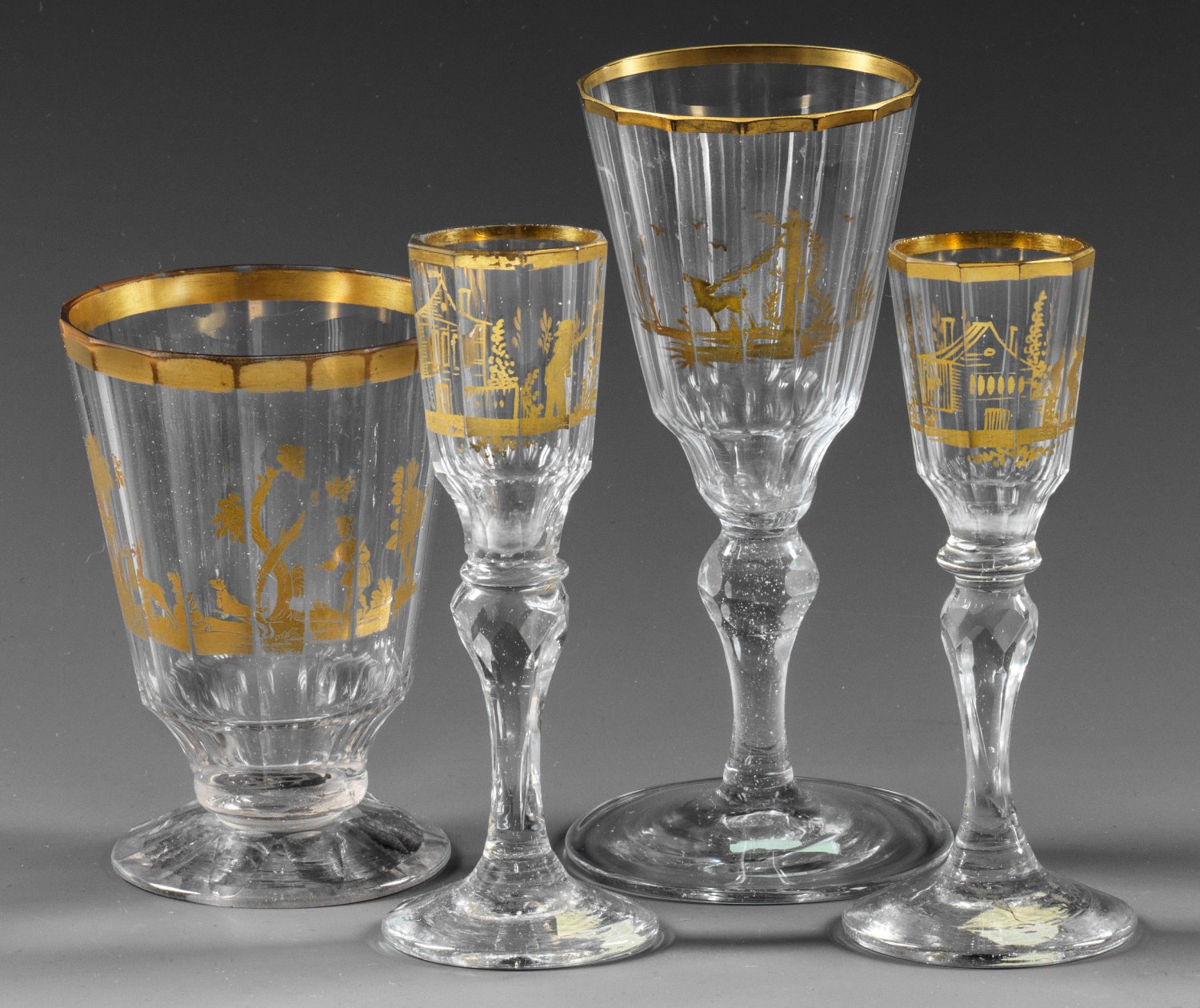 Farbloses Glas, geschliffen. Fußbecher und drei Kelchgläser. Schaft bzw. Kuppa polygonal facettiert und geschält. Unterschiedliche Dekore mit Figuren und Tieren sowie Jagdszene in Goldmalerei. H. 9,8 cm-13,5 cm.