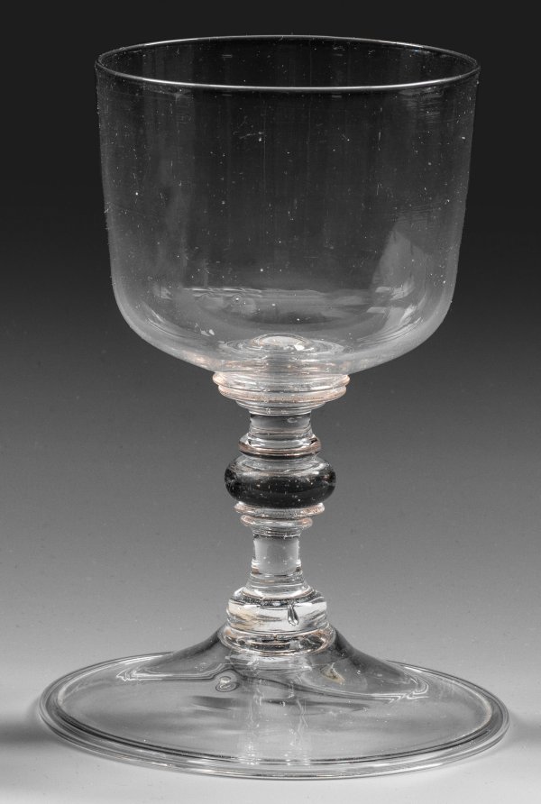 Farbloses Glas. Großer, leicht ansteigender Scheibenfuß mit Abriss und umgeschlagenem Rand, der Balusterschaft mit gedrücktem Kugelnodus und Ringscheiben. Zylindrische, unterhalb gerundete Kuppa. Etikett der Sammlung Uwe Friedleben, Hannover. H. 17,5 cm.