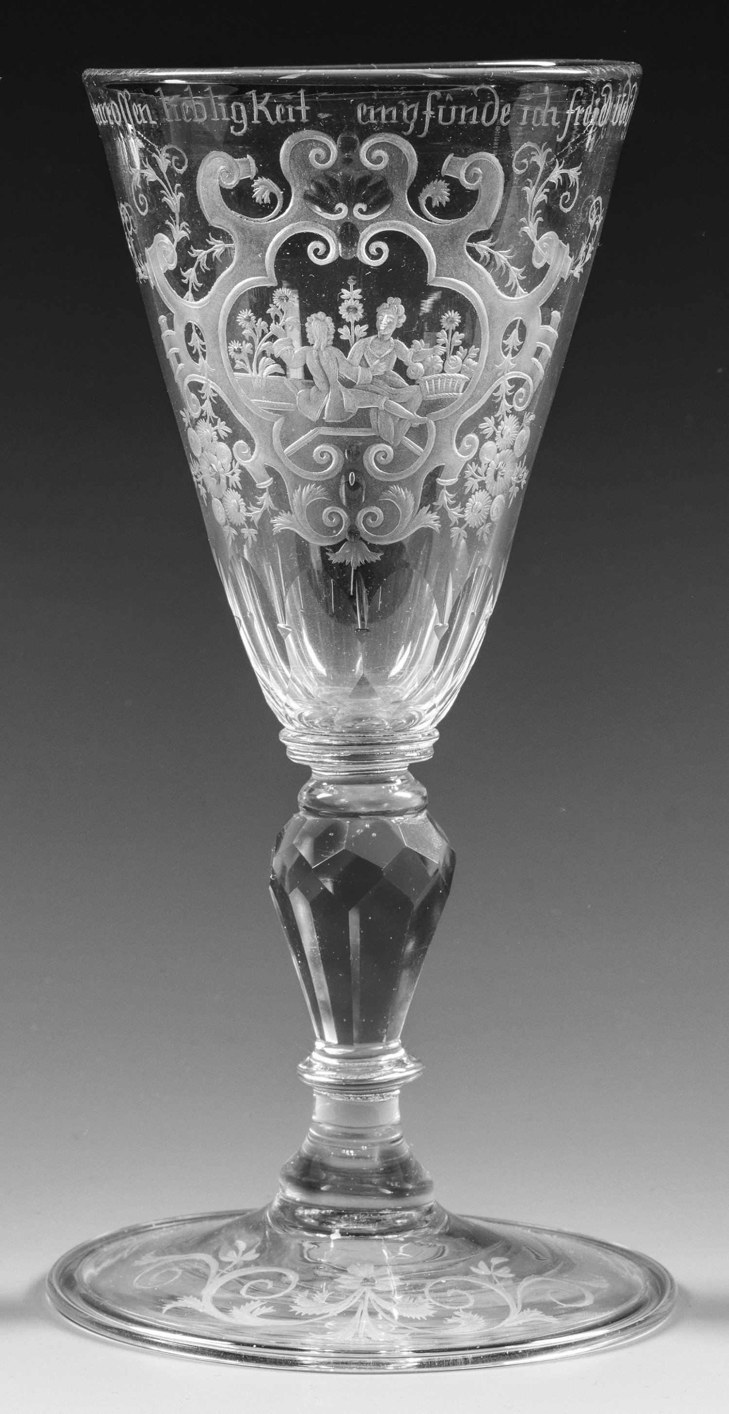 Farbloses Glas, geschliffen und graviert. Ansteigender Scheibenfuß mit umgeschlagenem Rand, facettierter Balusterschaft, abgesetzte, am gemuldeten Ansatz geschliffene, konische Kuppa. Schauseitig teilw. geblänkter Schnittdekor, in passiger Bandelwerkkartusche Darstellung eines zwischen Rosen sitzenden barocken Paares; unterhalb des Lippenrandes entsprechender Sinnspruch "In deren rossen liebligKeit- empfunde ich freud Und sussigKeit". H. 20,2 cm.