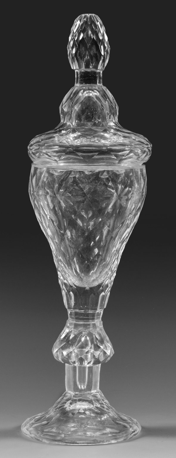 Farbloses Glas, geschliffen. Mehrfach unterschiedliche Glockenformen wiederholender Pokal mit derartig gestaltetem Fuß, Balusterschaft, Kuppa und Deckel. Ausgeschliffener Abriss, im Schaft eine eingestochene Luftblase, der geschweifte, mittig hochgezogene Deckel mit zapfenförmigem Knauf. Außergewöhnliche, die gesamte Oberfläche des Objektes bedeckende Wabenfacettierung als Schliff. Minim. crisseliert. H. 41,5 cm.