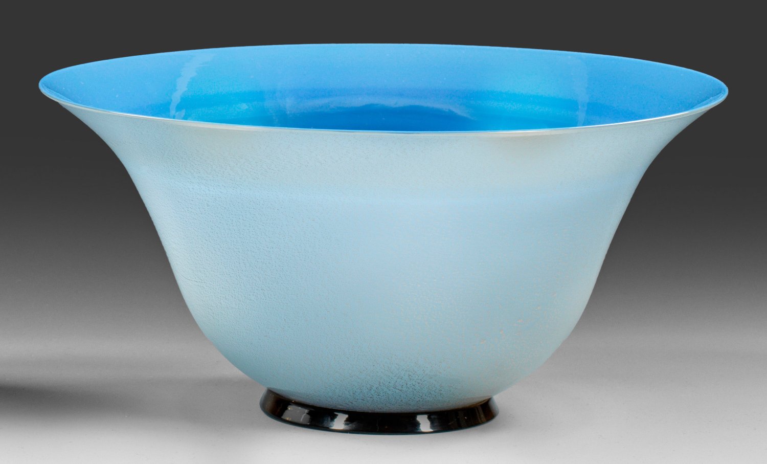 Glockenform auf kleinem Fuß. Hellblaues Opalglas, dünner Überfang aus hellcremefarbenem, milchigem Glas mit Einschmelzungen aus fein zersprengter Goldfolie, der Fuß aus hellbernsteinfarbenem Glas. Geritzte bzw. gravierte Sign. mit Dat. "venini 82". H. 13,8 cm; D. 23,8 cm.