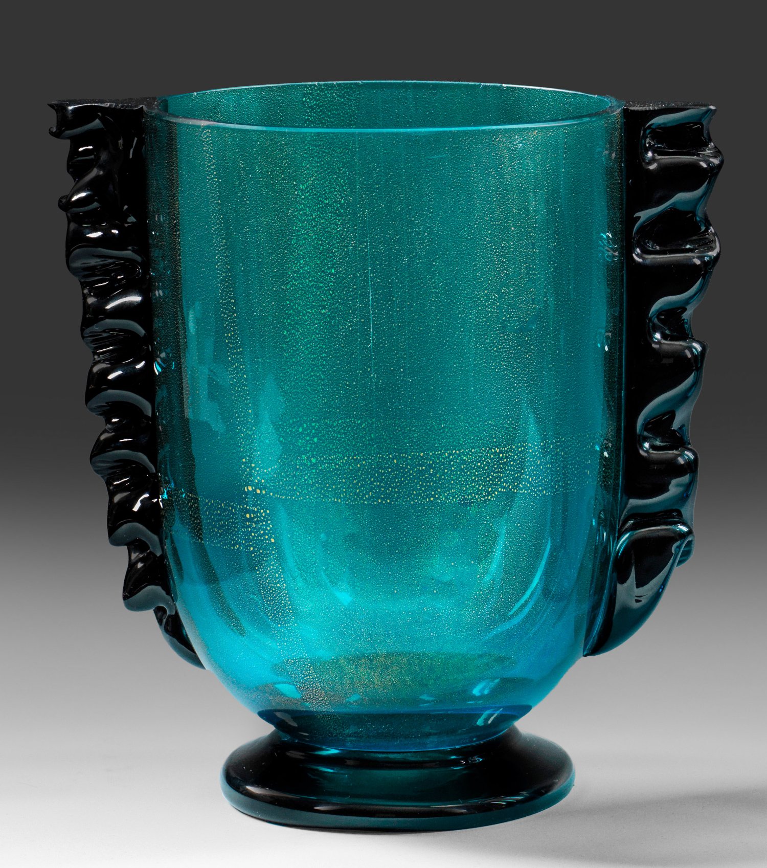 Auf ausgestelltem, massivem Fuß abgesetzte, unterhalb gerundete Becherform, seitlich zwei angesetzte, gewellt gekniffene, flügelartige Griffstege. Türkisblaues Glas mit Einschmelzungen aus fein zersprengter Goldfolie, Fuß und Griffe aus schwarzem Glas. Undeutl. sign.; H. 23,5 cm.