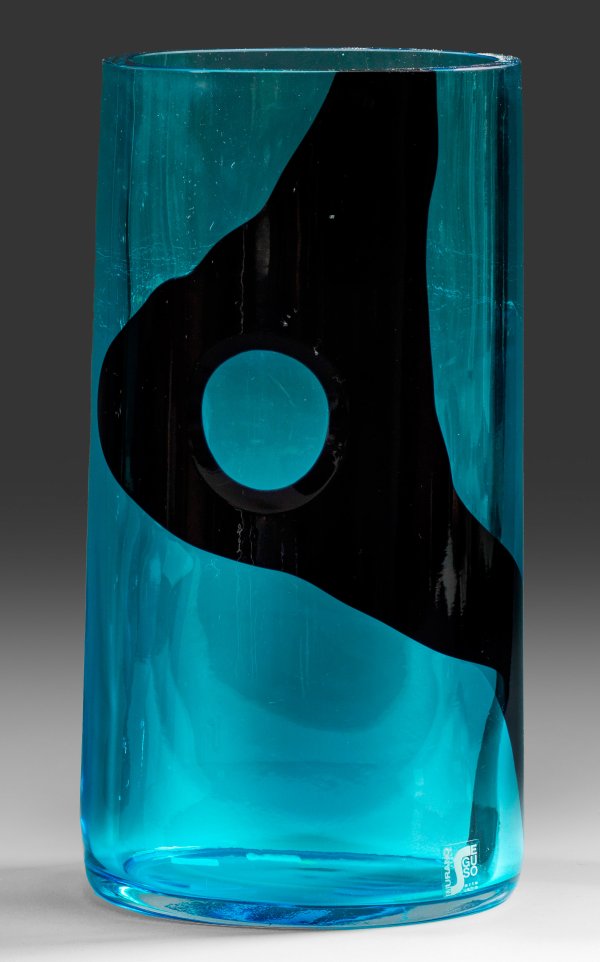 Ins Oval gedrückte Becherform mit gerader Wandung. Starkwandiges helltürkisblaues Glas, schauseitig asymmetrische, bandförmige, schräggezogene, eingeschmolzene Einlage aus schwarzem Glas mit mittiger Kugelschliff-Linse. Firmen-Etikett mit Bez. "MURANO ITALY (/) SEGUSO arte vetro". H. 27,5 cm.
