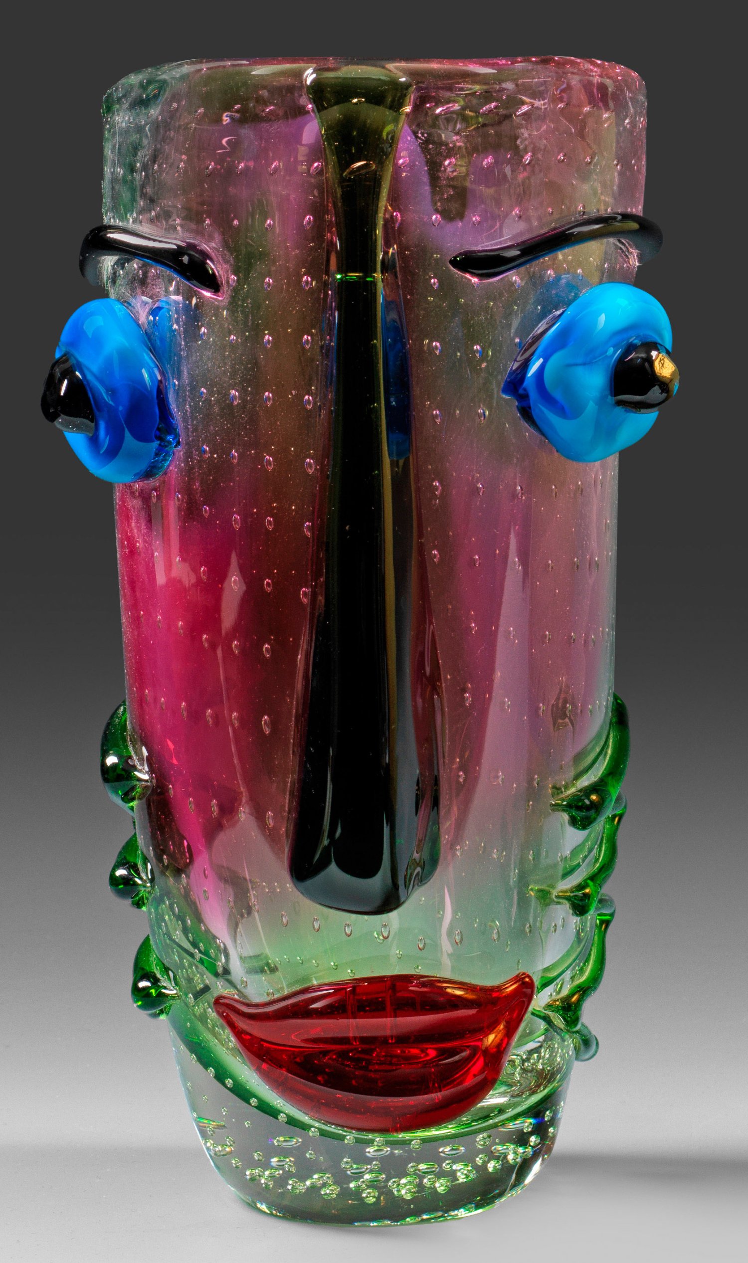 A modern face-shaped Murano multi-coloured glass vase with bubbles in the style of Pablo Picasso.