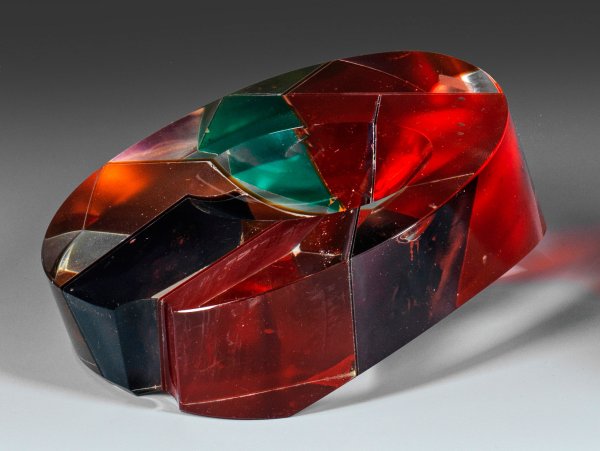 Ovale, schräg liegende Form, gestaltet mit Einzelelementen aus dickem, farblosem, an den Innenflächen unterschiedlich farbigem Kristallglas. Überarbeitet durch Schliff, an einer Außenkante konkav ausgekerbt, auf der Oberseite eine konkave Ovalform und ein hierin eingetieftes, eichelartiges Motiv. Ca. 7,8 cm x 16,5 cm x 14,2 cm.