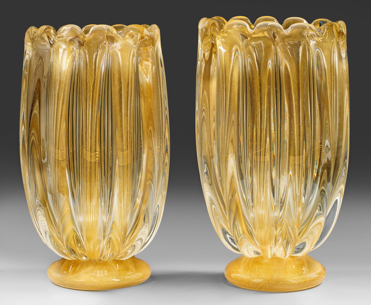 Als Paar verwendbar. Auf massivem, konisch ausgestelltem Fuß abgesetzter, ovoid hochgezogener, stark vertikal gerippter und ins Oval gedrückter Korpus, der Rand gewellt gekniffen. Dickwandiges, farbloses Glas mit Einschmelzungen aus fein zersprengter Goldfolie. Gravierte Sign. "Toso Murano". H. 34 cm-34,5 cm.