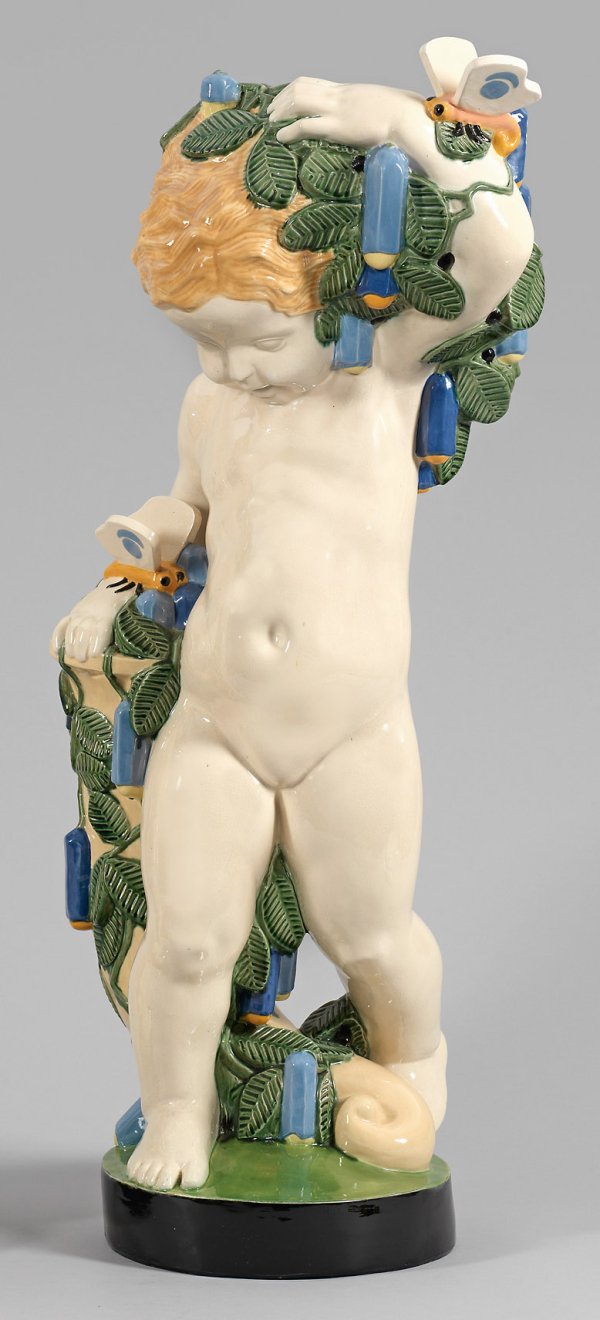 Steingut. Auf runder Plinthe vollplastische Darstellung eines stehenden Putto mit Füllhorn, Blumenranken und zwei Schmetterlingen. Polychrome Unterglasurstaffierung. Modell-Nr. 1315. Minim. rep.; Entw. Hubert Kovarik, um 1910-1915. Firmenmarke mit Bez. "Austria". H. 95 cm.
