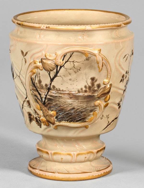 Beigefarbene Glasur. Reliefdekor in Kombination mit Email- und Goldmalerei im Rokoko-Stil. Schauseitig Kartusche mit Landschaft, flankiert von Rosen- und Blütenzweigen sowie Vogel. Fuß ger. rest.; Sign. "E. Gallé Nancy". H. 20,5 cm.