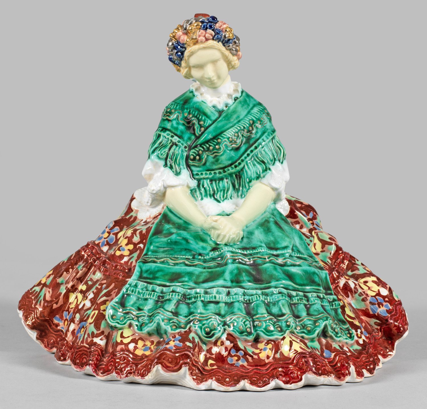 Keramik, heller Scherben, weiß bzw. farbig glasiert, polychrom sowie in Gold und Silber bemalt. Sitzende, junge Dame in ungarischer Tracht mit Blumenkranz im Haar. Modell-Nr. 436. Entw. Emilie Schleiss, um 1910. Minim. best.; Entw.-Monogr. "E S", eingepresste Werkstattmarke. H. 25 cm.