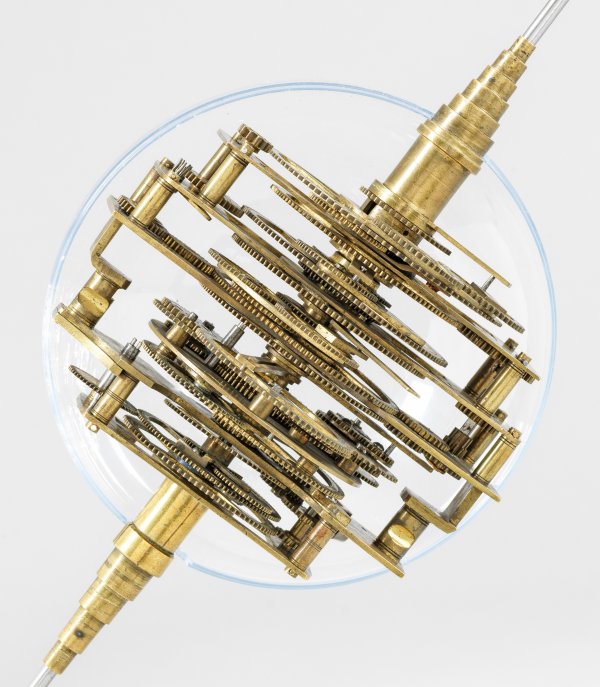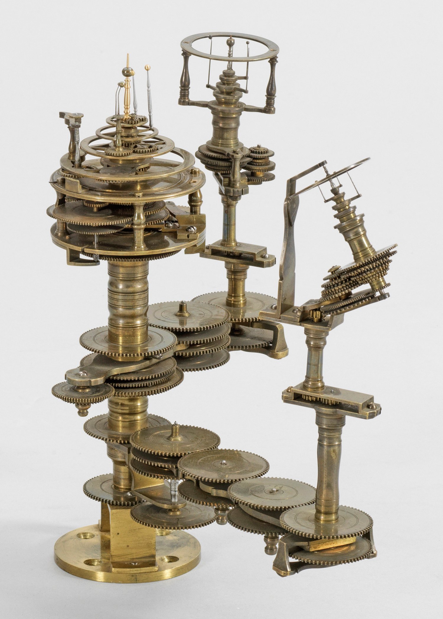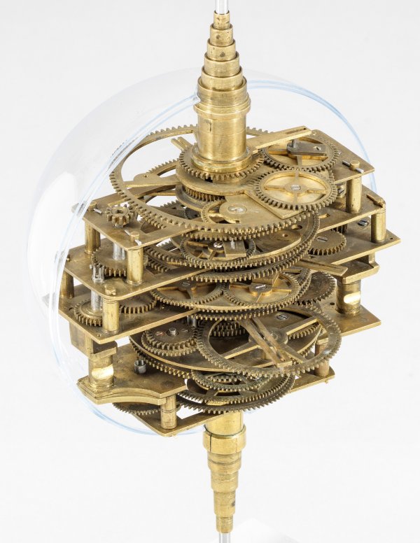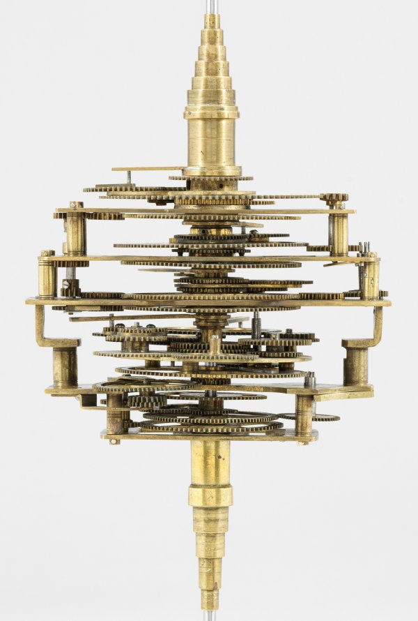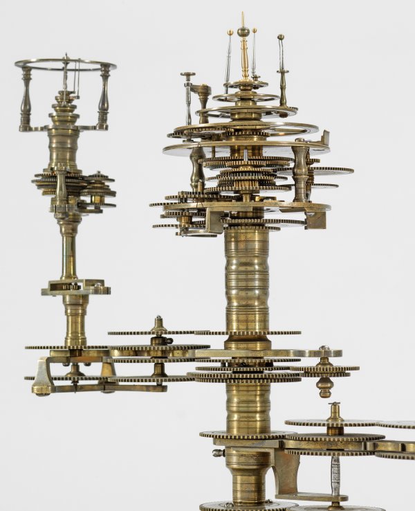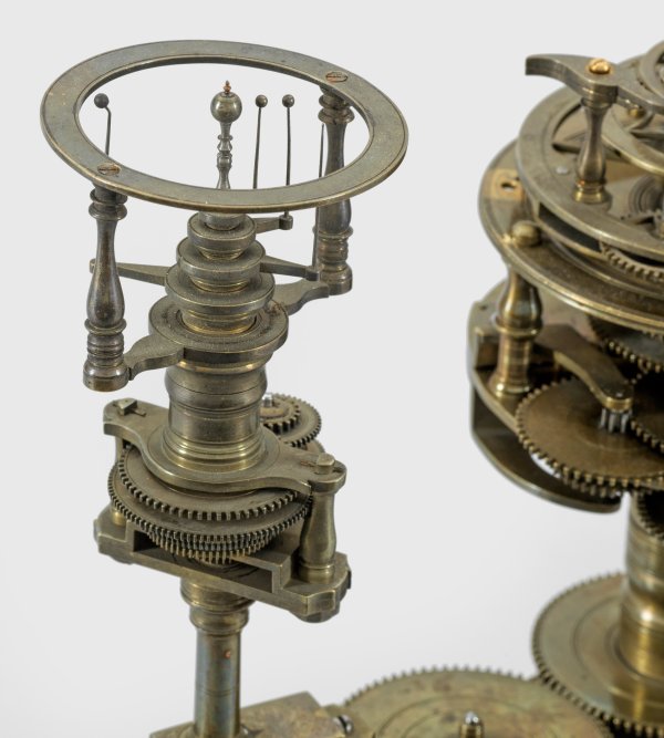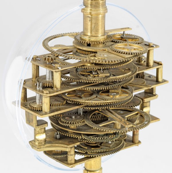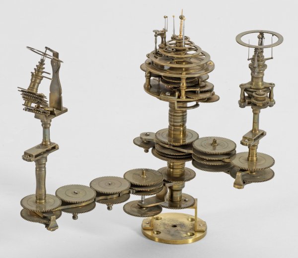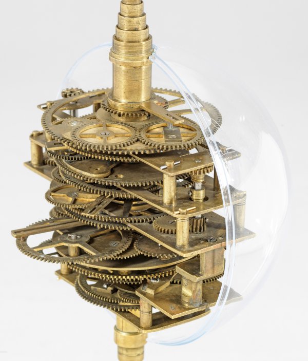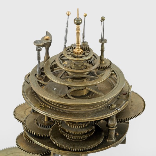 Messing und Stahl/Eisen. Die vorliegende "Weltmaschine" mit seiner astronomischen Uhr ist als feinmechanisches und naturwissenschaftliches Wunderwerk ein äußerst seltenes Objekt, das um 1780-1790 entstand. Außer dieser sind nur drei weitere "Weltmaschinen" in Museumsbesitz bekannt. Es besteht aus einem kopernikanischen Planetarium und dem Räderwerk für einen Himmelsglobus. Im Zentrum des kopernikanischen Systems werden die Bewegungen von Merkur, Venus, Erde, Mond und Mars angezeigt, mittig die auf einer Stange montierte Sonne. Auf einem seitlichen Ausleger befindet sich das Jupitersystem mit vier Monden; gegenüberliegend - mit geneigter Achse - sitzt das Saturnsystem, wobei der Ringplanet von fünf Monden umgeben ist. Die zusammengehörigen Bestandteile stehen aufgrund der frappanten, bis in die Details gehende Ähnlichkeit in direktem Zusammenhang mit einer Riss-Schnittzeichnung eines kopernikanischen Systems nach einem Entw. von Philipp Matthäus Hahn (in der Württembergischen Landesbibliothek in Stuttgart, Cod. Math. 2° 34, fol. 1), außerdem mit der von Hahn 1780 gebauten berühmten sog. "Weltmaschine" im Schlossmuseum der Stiftung Schloss Friedenstein in Gotha (Inv.-Nr. 72/4576). Rest.; H. 35 cm.
