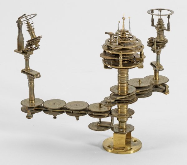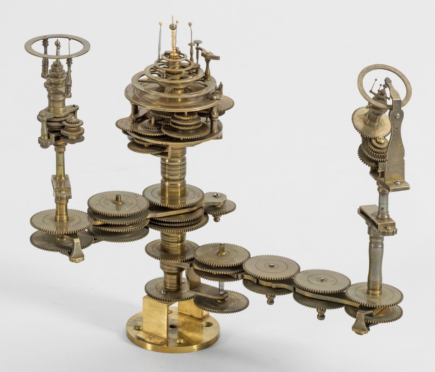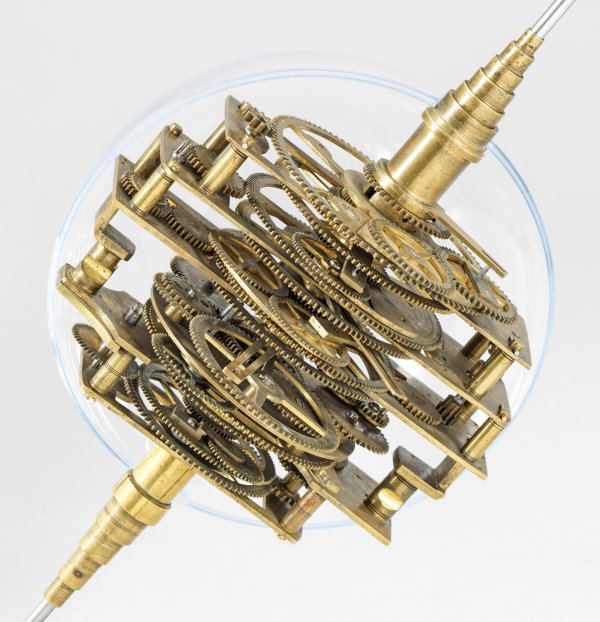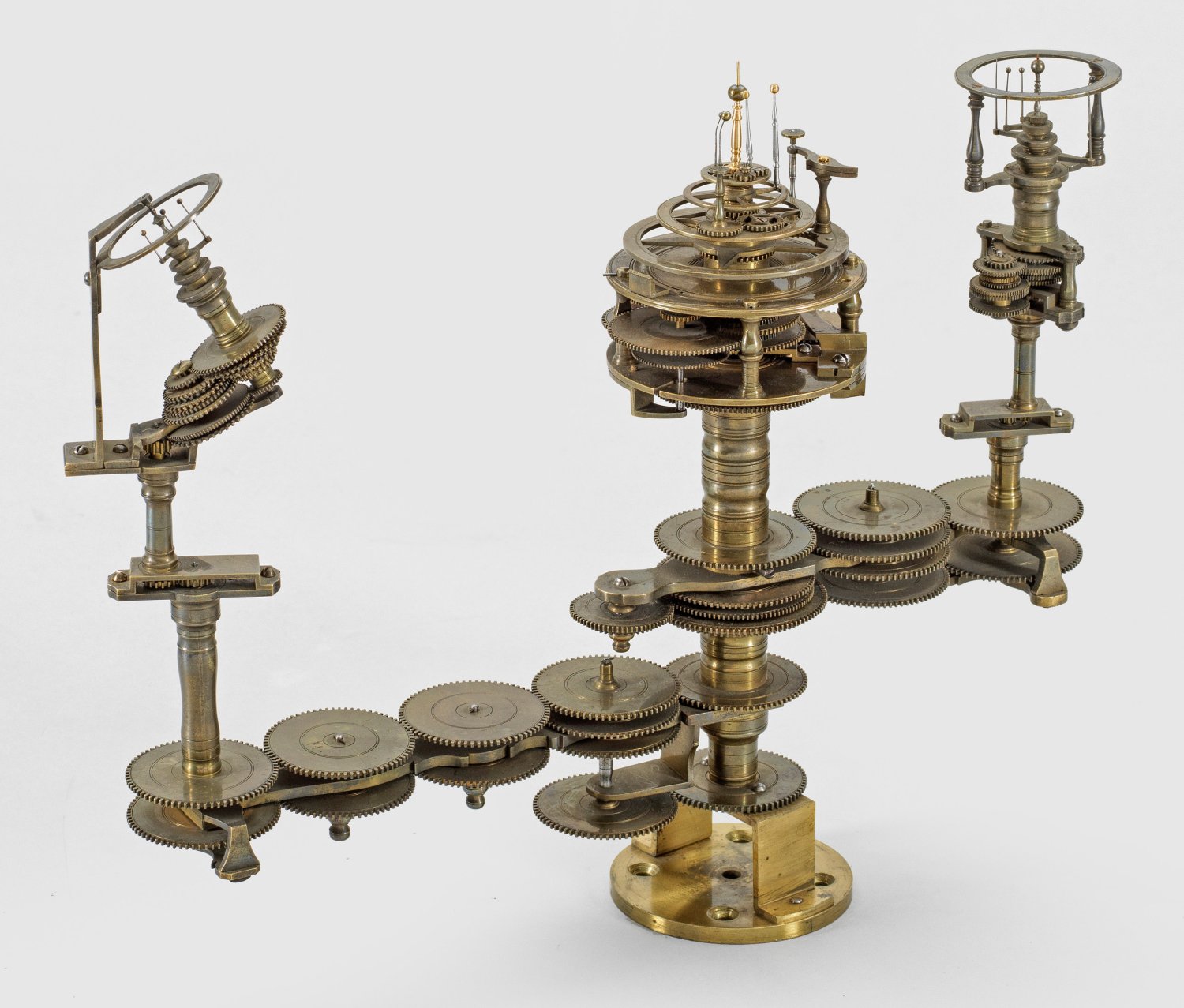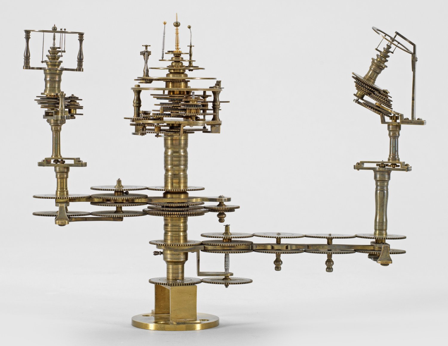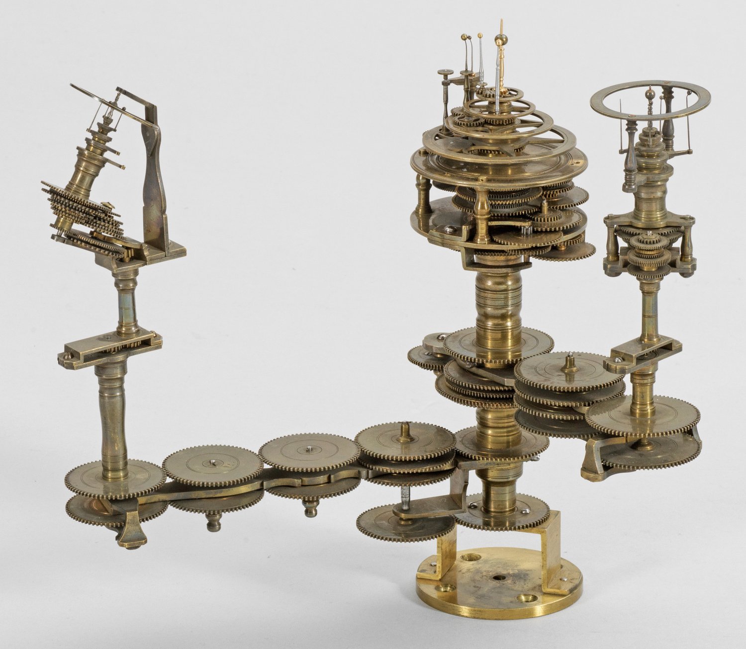 Messing und Stahl/Eisen. Die vorliegende "Weltmaschine" mit seiner astronomischen Uhr ist als feinmechanisches und naturwissenschaftliches Wunderwerk ein äußerst seltenes Objekt, das um 1780-1790 entstand. Außer dieser sind nur drei weitere "Weltmaschinen" in Museumsbesitz bekannt. Es besteht aus einem kopernikanischen Planetarium und dem Räderwerk für einen Himmelsglobus. Im Zentrum des kopernikanischen Systems werden die Bewegungen von Merkur, Venus, Erde, Mond und Mars angezeigt, mittig die auf einer Stange montierte Sonne. Auf einem seitlichen Ausleger befindet sich das Jupitersystem mit vier Monden; gegenüberliegend - mit geneigter Achse - sitzt das Saturnsystem, wobei der Ringplanet von fünf Monden umgeben ist. Die zusammengehörigen Bestandteile stehen aufgrund der frappanten, bis in die Details gehende Ähnlichkeit in direktem Zusammenhang mit einer Riss-Schnittzeichnung eines kopernikanischen Systems nach einem Entw. von Philipp Matthäus Hahn (in der Württembergischen Landesbibliothek in Stuttgart, Cod. Math. 2° 34, fol. 1), außerdem mit der von Hahn 1780 gebauten berühmten sog. "Weltmaschine" im Schlossmuseum der Stiftung Schloss Friedenstein in Gotha (Inv.-Nr. 72/4576). Rest.; H. 35 cm.